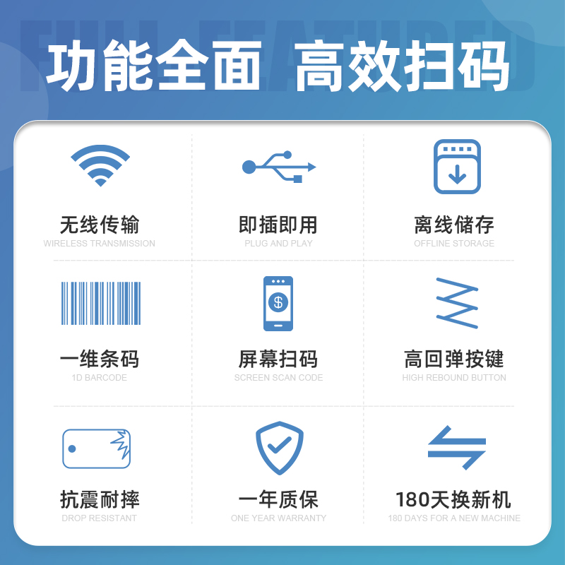 逊镭无线扫描枪配备红光CCD加速解码芯片,准确识别各类常见一维码。外表采用ABS注塑材质,韧性强,耐摔不易掉色。适用于多种行业,商店超市、医院药店、物流快递、餐厅甜品店;扫码收银更便捷。