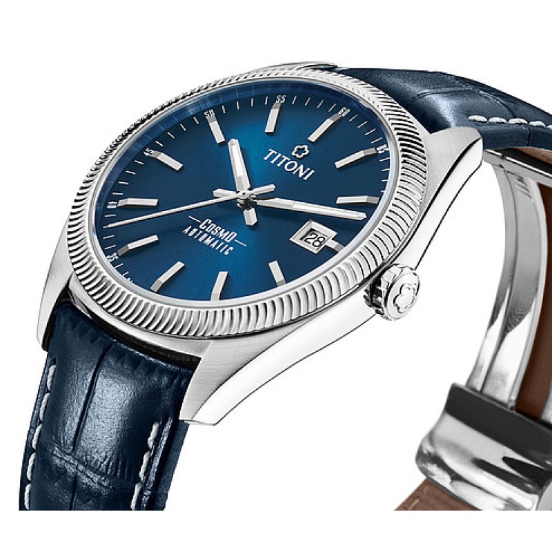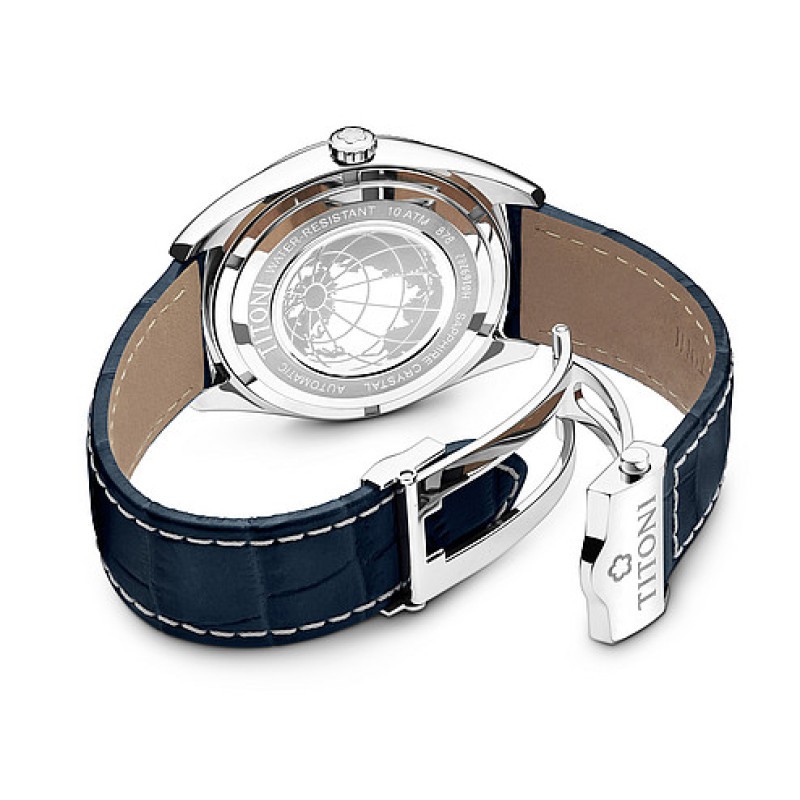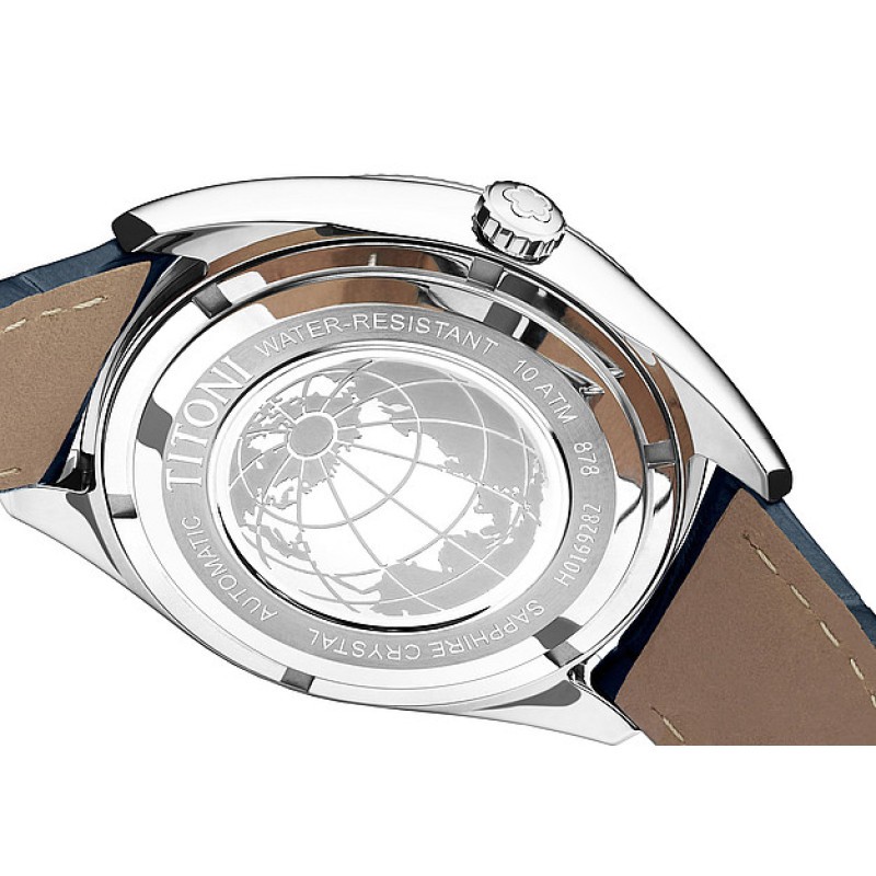 TITONI 梅花 宇宙系列 男士自动机械表 878 S-ST-612 波浪纹表圈,多切面的指针和时标。指针上带有夜光点,表冠带有波浪纹路。表底盖有宇宙系列特色图案标识。机械机芯,表盘直径41mm,防水深度100m。