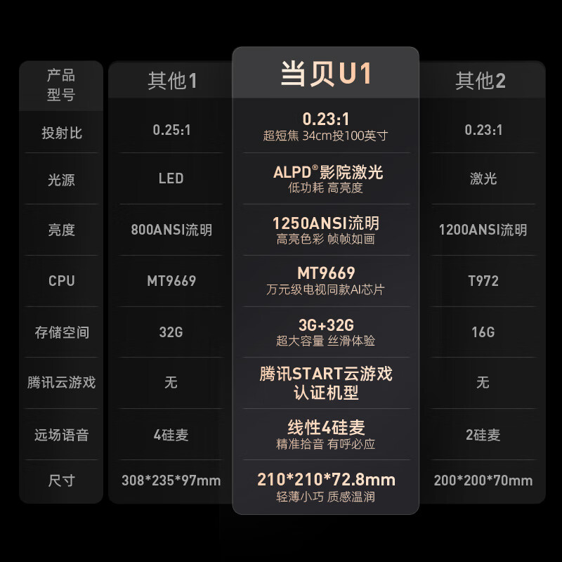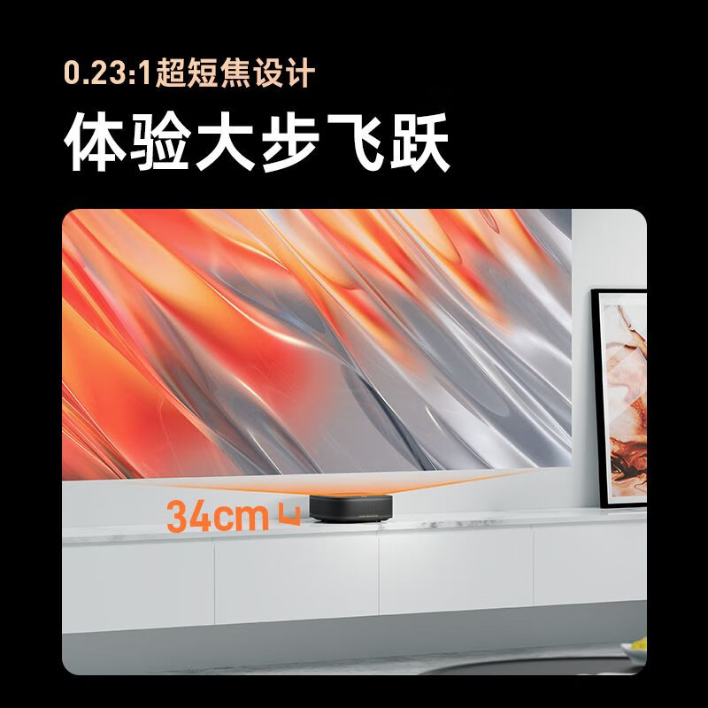 当贝 U1 使用ALPD低能耗激光光源,亮度高达1250ANS流明,亮度更高,能耗更低。支持1080P,采用投射比仅023:1的超短焦成像设计,贴墙仅需25cm便可投出80英寸的画面;稍远一些,34cm就能拥有100英寸巨幅画面。