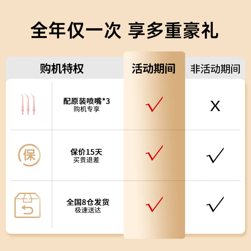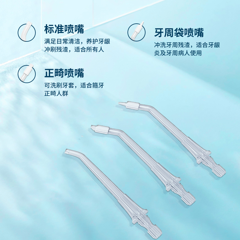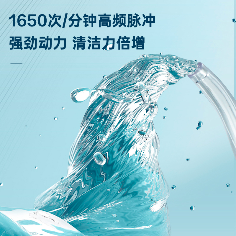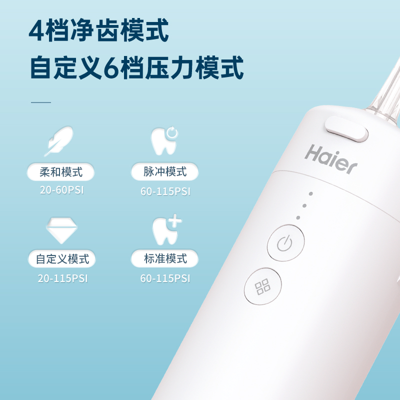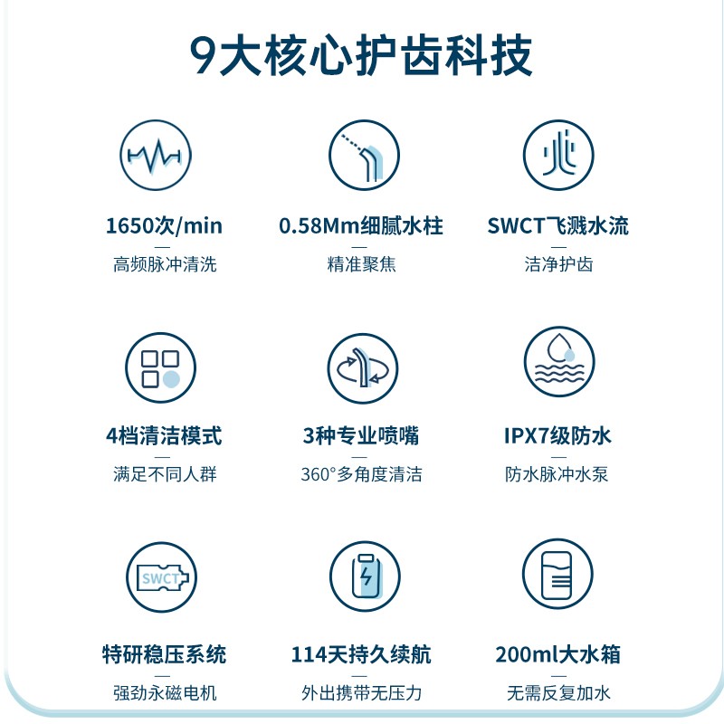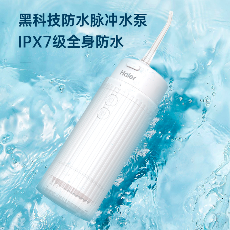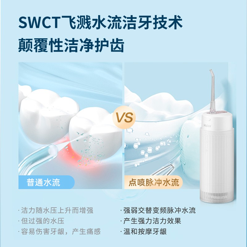 海尔旗舰新品小浪花,量尺定制,一触即净,一分钟深层洁齿,14天还原净白,9大核心护齿科技,1650次/min高频脉冲清洗,0.58Mm细腻水柱,精准聚焦,SWCT飞溅水流,洁净互齿,4档清洁模式,满足不同人群,3种专业喷嘴,360度多角度清洁,IPX7级防水,防水脉冲水泵,特研稳压系统,强劲永磁电机,100天持续续航,外出携带无压力,200ml大水箱无需反复加水。