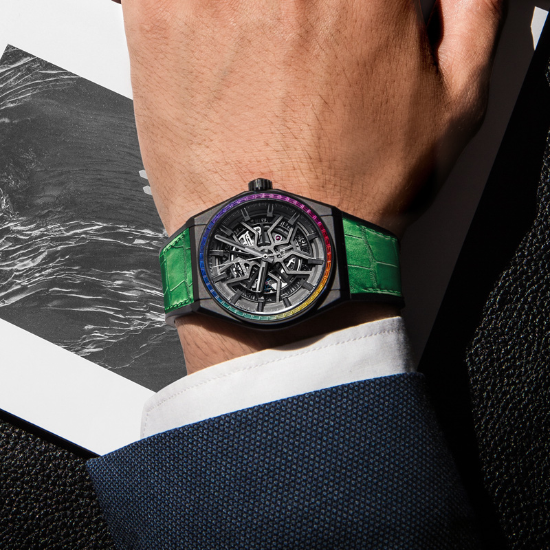DEFY Classic Rainbow限量版腕表,其独特之处在于缤纷宝石镶嵌而成的表圈,表圈镶嵌48颗狭长方形切割蓝宝石散发出整个彩虹的渐变色泽,带有星形图案的开放式表盘,营造出和谐的视觉深度感,弧形双面防眩处理人工合成蓝宝石水晶玻璃表镜,直径41毫米,材质采用磨砂钛金属,动力储备约50小时,防水深度3ATM(30米),白色橡胶配备蓝色鳄鱼皮衬里和白色缝线。