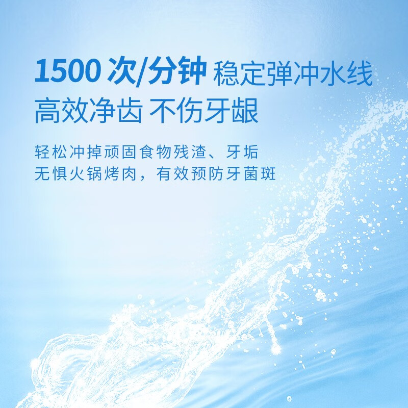 20psi-120psi无极水压调节。轻柔、强劲和自定义三中模式可供选择。适用不同人群。利用1500次/分钟的稳定水流高效清理食物残渣和牙垢。0.60mm的超细水线,深入牙缝内部,不留清理盲区。