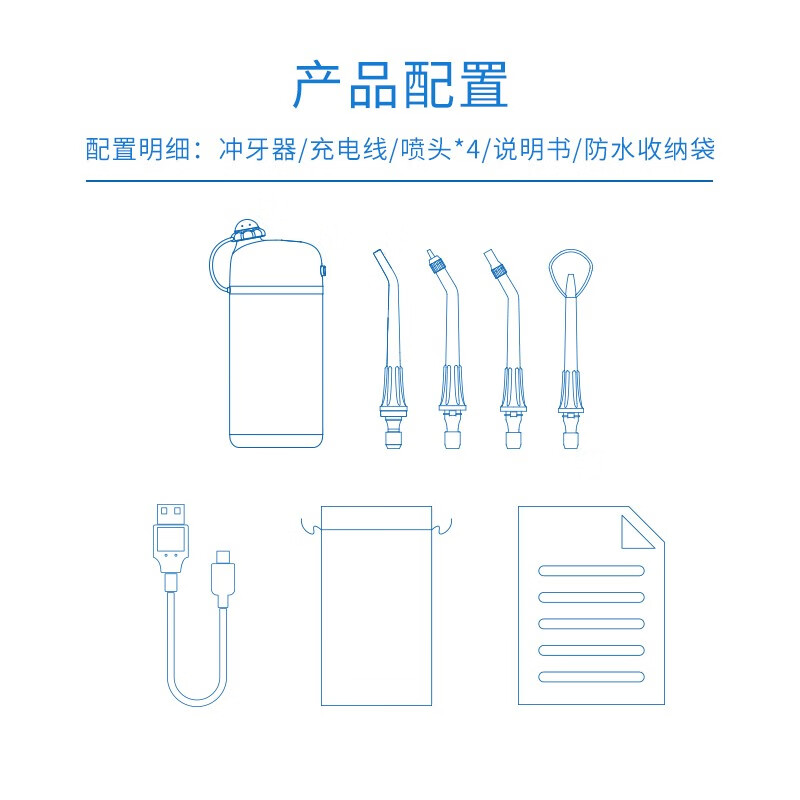 随机身附带四种喷嘴。分别是标准喷嘴,用于口腔日常清理。正畸喷嘴,用于清理牙套缝隙。牙周袋喷嘴,利用超细水流精准清理齿龈缝隙和牙周袋。舌刮喷嘴,用于清理舌苔表面。可满足您的不同使用需求。