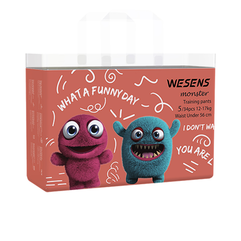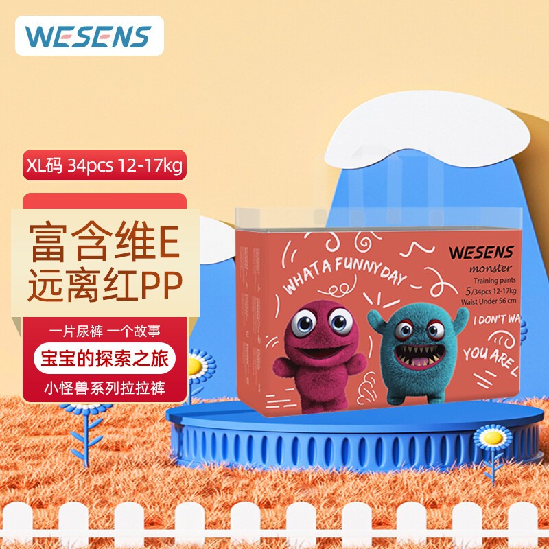 1985年,wesens诞生于德国,寓意质之本真,安全婴童用品领导者。wesens定位于新一代母婴用户,专注于打造乐趣天然,以及凸显辣妈时尚品味的品牌形象。小怪兽系列纸尿裤拥有别具一格的卡通包装,色彩鲜亮趣味十足,面层添加乳木果油精华,富含维E,充分渗透滋养,养护宝宝娇嫩PP,远离换季时干燥过敏的烦恼;底层采用细旦纤维,细腻柔滑,透气面层迅速呼出闷热湿气,保证时刻干爽;芯体海量吸收,均匀导流,不起坨、不断层;环抱式弹性腰围,环抱式弹性腰围,配合3D立体剪裁,贴合宝贝曲线,好动宝宝也能自如活动,不担心侧漏。