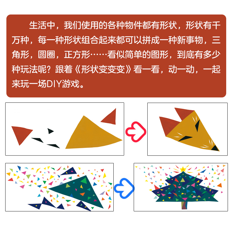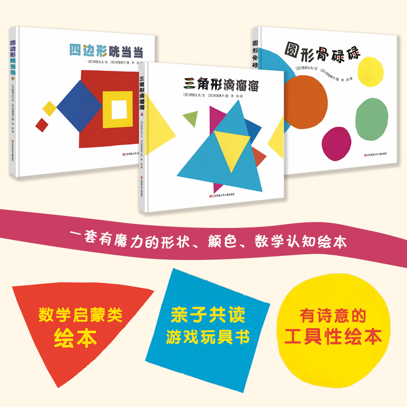 这是一套幼儿数学游戏绘本,用朗朗上口的童谣式的语言描绘了形状的组合变化。包括《圆形骨碌碌》《三角形滴溜溜》《四边形咣当当》,不同颜色、不同大小的三角形、圆形、四边形,通过不同的组合,可以变成生活中常见的物品。适合用来做亲子间的手工活动,在轻松的游戏中,让孩子认识不同的颜色、形状以及各种物品。画面简单、色彩绚丽,充满童趣,给孩子艺术熏陶和感染。富有诗意的童谣式语言,培养孩子语言表达能力和想象力。随书附赠形状游戏卡,让孩子在游戏中感知形状世界的丰富变化。