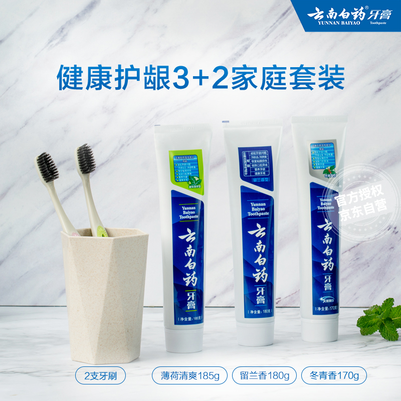 该套装包含3支云南白药牙膏和2个牙刷,牙膏含有特有的药物活性成分,能促进牙龈血液循环,长期使用可以防止牙龈出血,预防牙周炎、牙龈萎缩等口腔疾病。此款套餐牙膏含薄荷香型185g+留兰香型180g+冬青香型170g,可以满足家庭中不同人的需要。