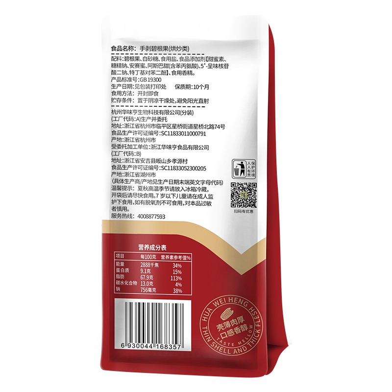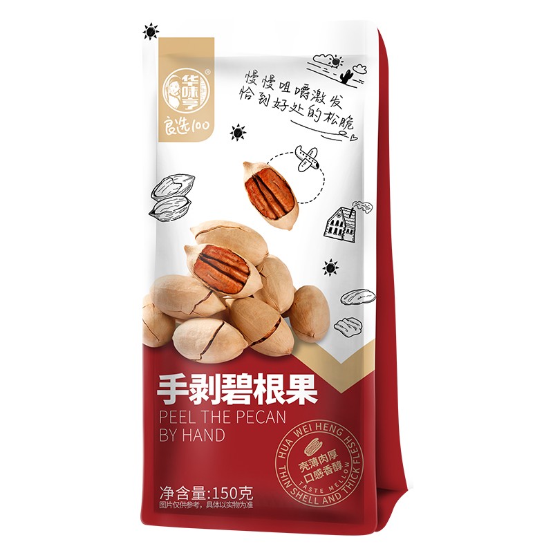 果仁饱满完整,果肉色泽金黄,壳薄,果仁饱满厚实,开口易剥。口感清香甘甜,嫩脆有嚼劲。可用作休闲零食食用。规格:150g 。