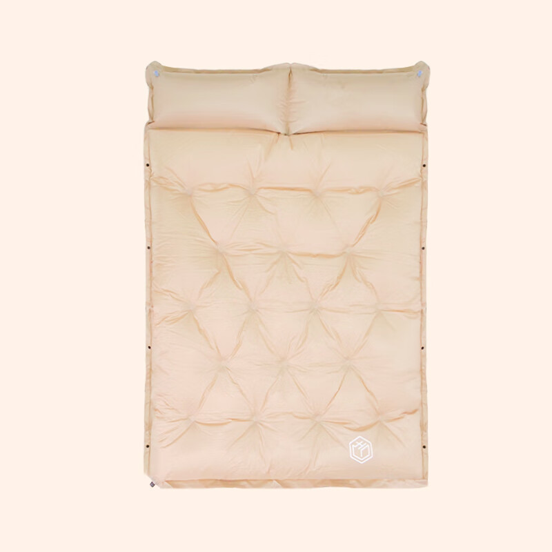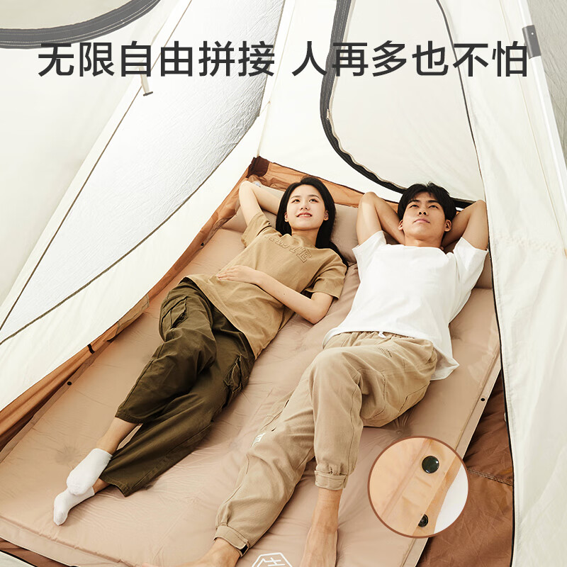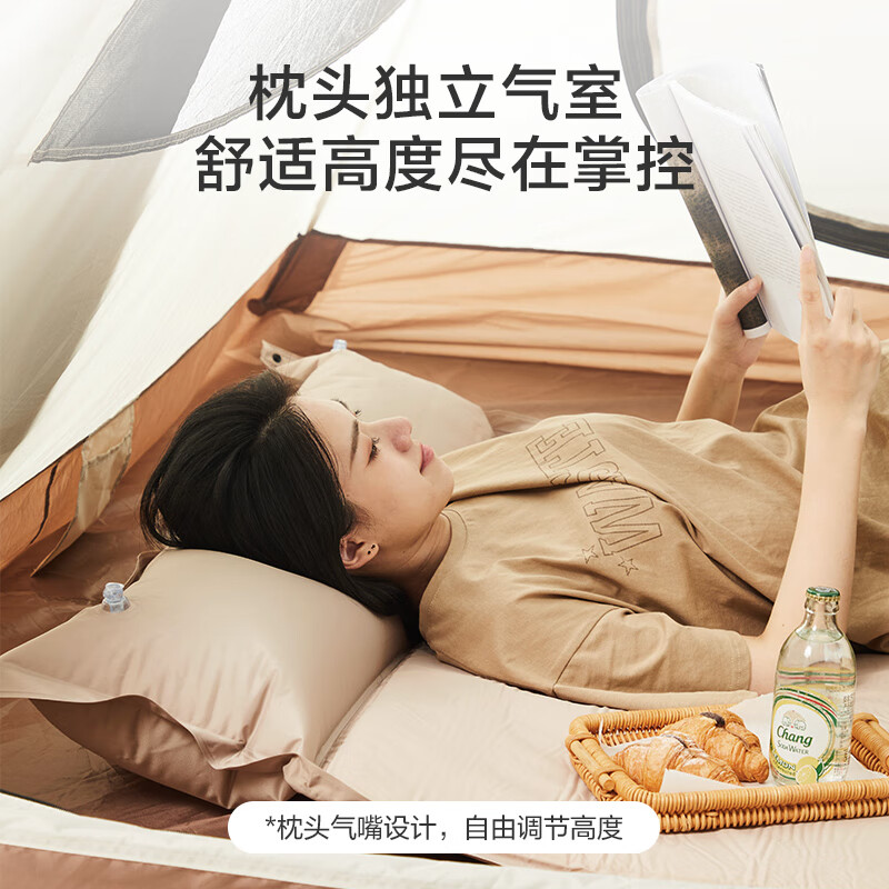 户外自充气床垫,省时省力,可调节气量定制你的专属舒适;三层结构,高弹海绵结合耐脏防泼水春亚纺面料,牢固耐磨;高频热压工艺,无缝不漏气。