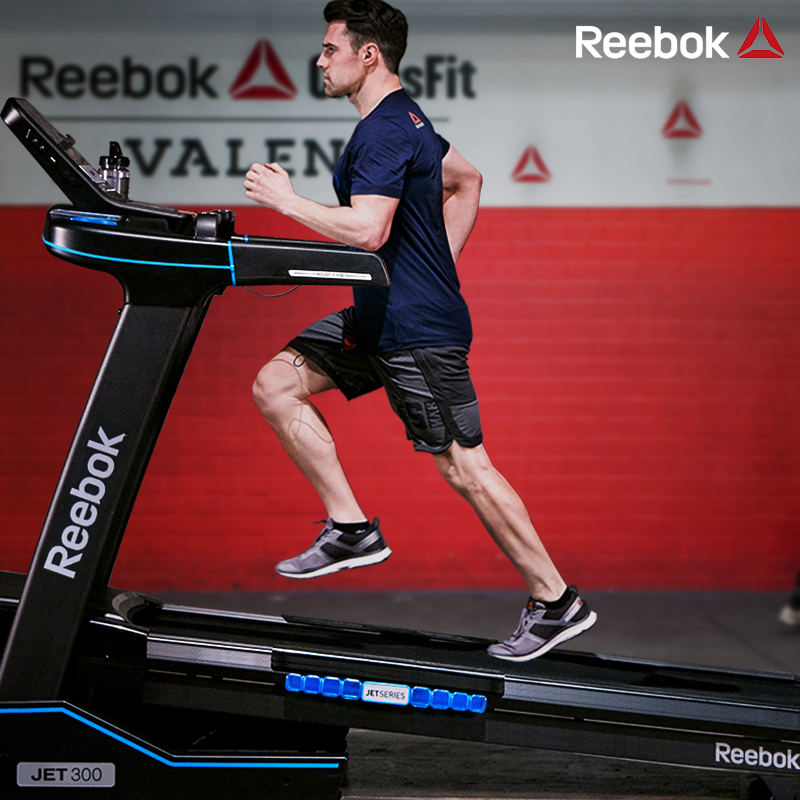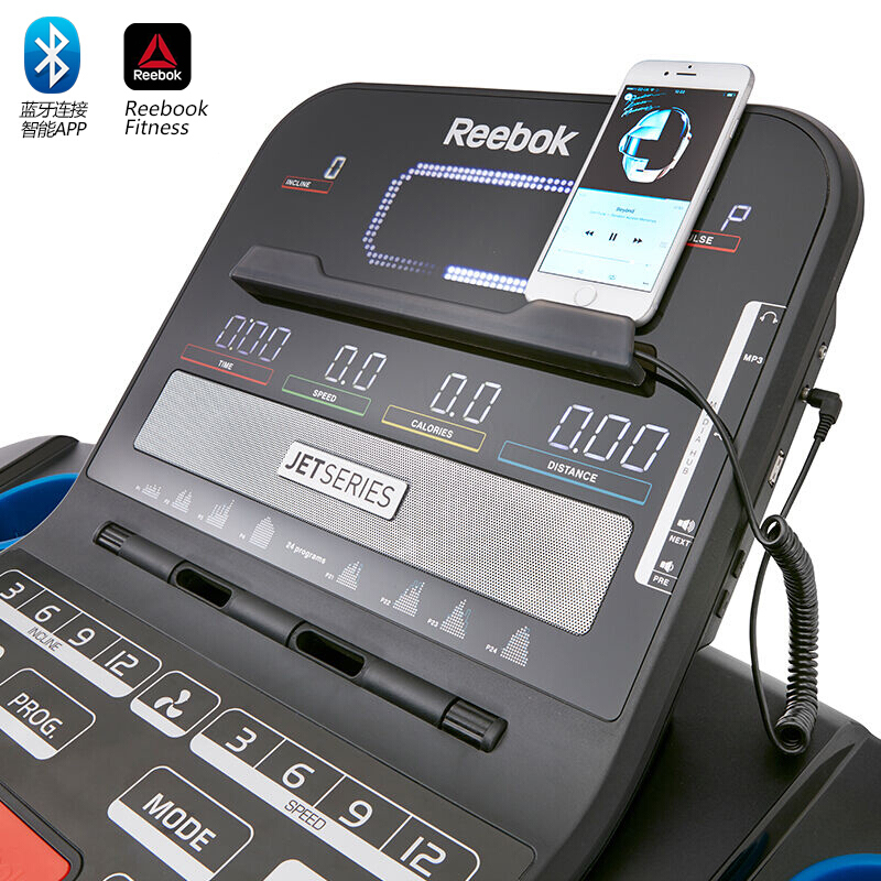 Reebok 锐步 JET300 智能跑步机,可连接蓝牙App,锐步JETfuse新型空气减震系统,手握式心率监测,常规马达2.5,46*140CM跑带面积,内置27种运动程式,0-18KM/H速度调节,0-15度坡度调节,液晶显示屏等功能。