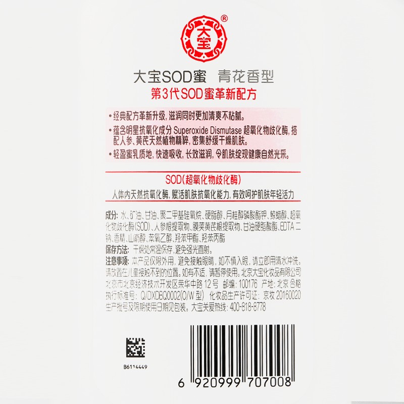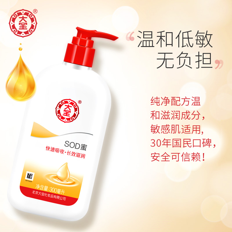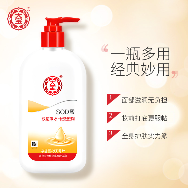 大宝是家喻户晓的品牌,这款SOD蜜,无刺激配方,适合各种肤质的人使用,含有黄芪精华,延展性好,质地清透,大宝以低价又实用的产品,赢得口碑。平时用来抹手、身体,糙一点的汉子还会用来抹脸。是一款全家适宜的产品。此款为300ml装,带泵头,更方便。