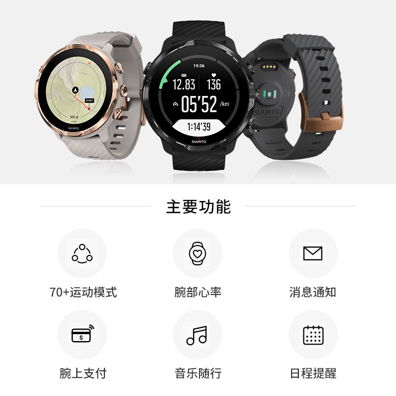 颂拓(SUUNTO)这款智能手表,可追踪使用者的运动路径;内置离线地图,能够查看地形细节、小径和等高线。支持连接手机,可播放、暂停或切换音乐;拥有支付功能,还能查看短信和消息提醒,便捷生活;多数安卓系统及IOS系统的手机均可匹配使用。
