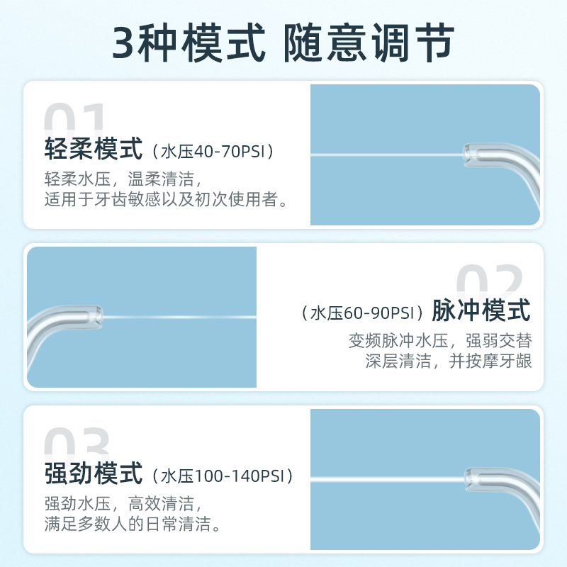 符合FDA食品级材质安全标准,选材安全有保证,孕妇、小孩都可以使用。1600次/分钟高压脉冲率,120PSI引强力水压,脉冲洁净技术,输出澎湃洁净力,彻底清洁口腔尽享齿间冲浪。优质锂电池充电仅约4小时,续航60天+,IPX8级防水整机可水洗更安心。