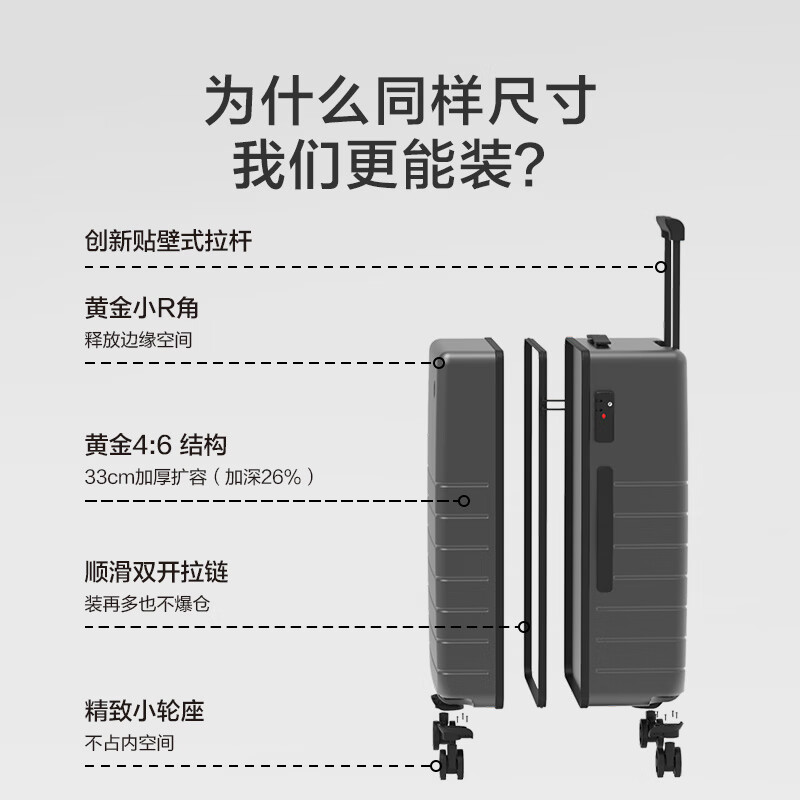 无界大深仓,超大超能装。德国科思创PC箱体,超6倍国标万向轮,纵向丝滑出行。德国科思创PC材质,钻石颗粒箱体更防刮,轻韧坚固不易裂,托运也不怕;超6倍国标万向轮,纵享丝滑出行。黄金4:6深仓结构,球鞋、大礼盒也能直接放。杜邦抗菌黑科技+干湿分离袋,贴身衣物湿物安心放
