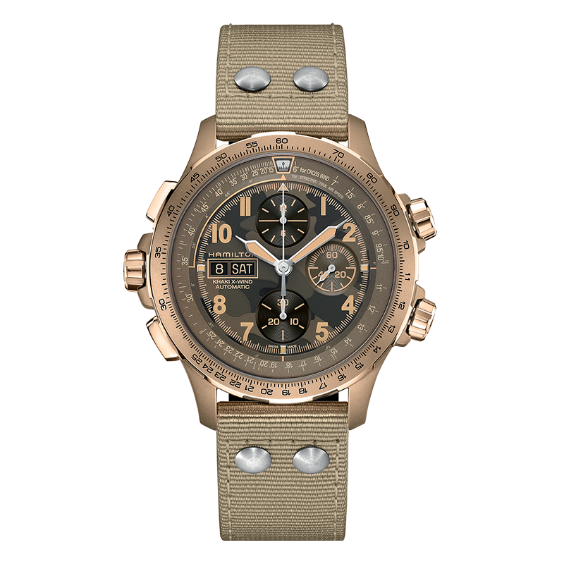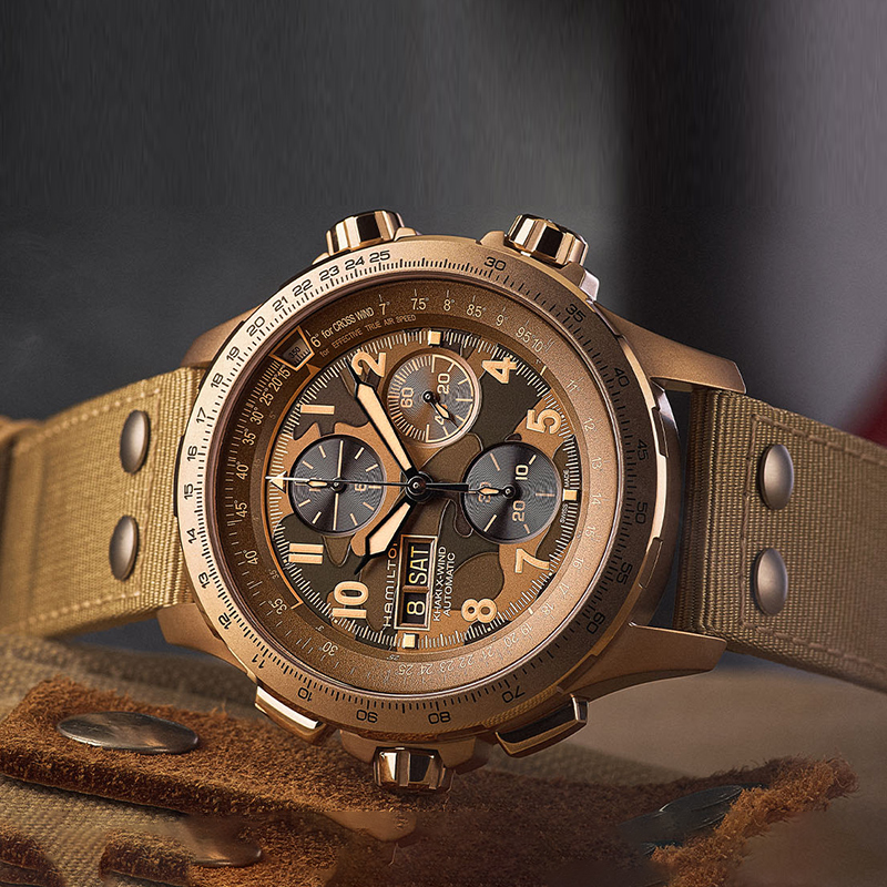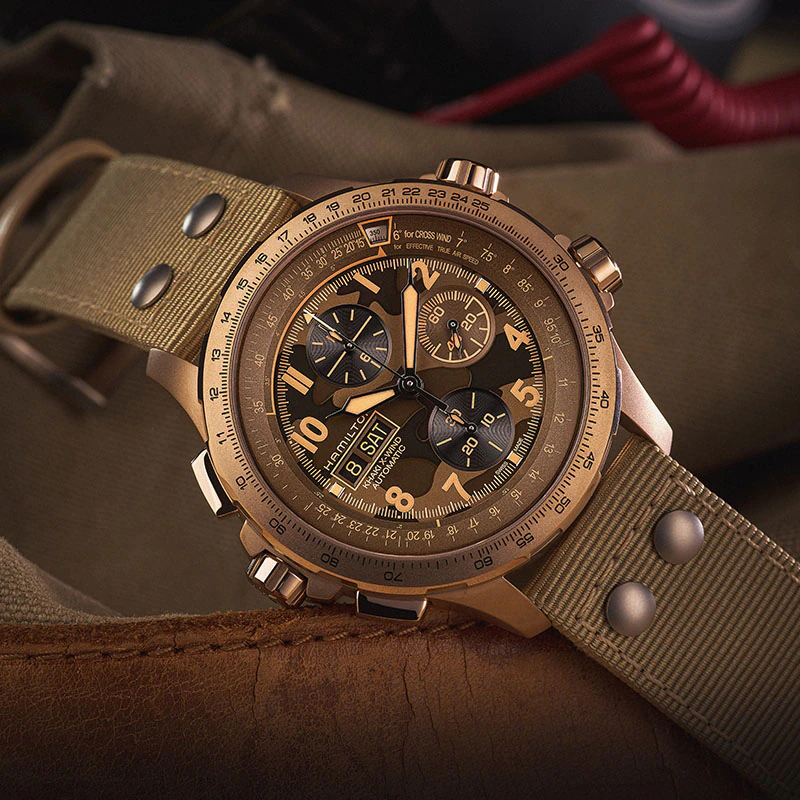 HAMILTON 汉米尔顿 卡其航空系列 男士机械表 H77916920,这款腕表在设计中起初是专为飞行员而设,以大胆前卫的全新面貌横空出世饰以迷彩图案,表盘、表带和表壳均采用全新配色伴您时刻开启冒险之旅。轻松抵御雷达设备等产生的磁场在复杂环境下,精准度和抗磁性能依旧卓越以确保在高空飞行中精准无误。45毫米表壳搭配高科技织物表带呈现出果敢时尚的造型,进一步彰显了腕表的冒险精神。