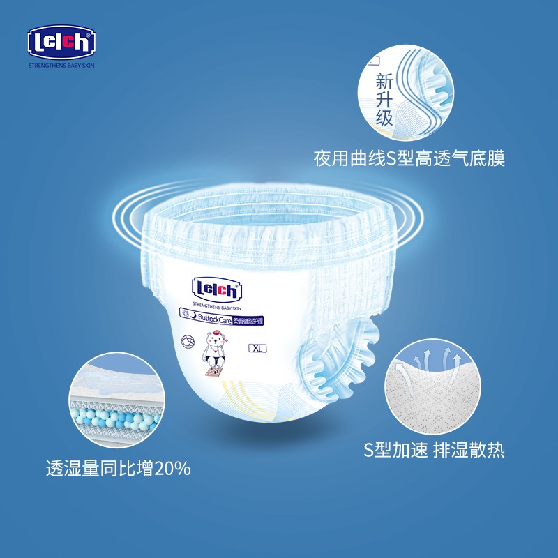 专利双向导流层无纺布,低滑渗率,快速吸收,瞬爽舒适,保持干爽。轻薄,柔薄复合专利芯体,强劲锁水,不易断层起垛,蝶翼形设计,贴合防漏。柔软超声波缝合技术,减少粘合剂,触感轻柔有弹性,侧面易撕,轻松穿脱。舒展人体工学W型剪裁,为学步期研制,舒展无阻碍,快乐学走。柔护,加宽舒适环抱弹性腰围,柔软贴身,防止侧漏后漏。