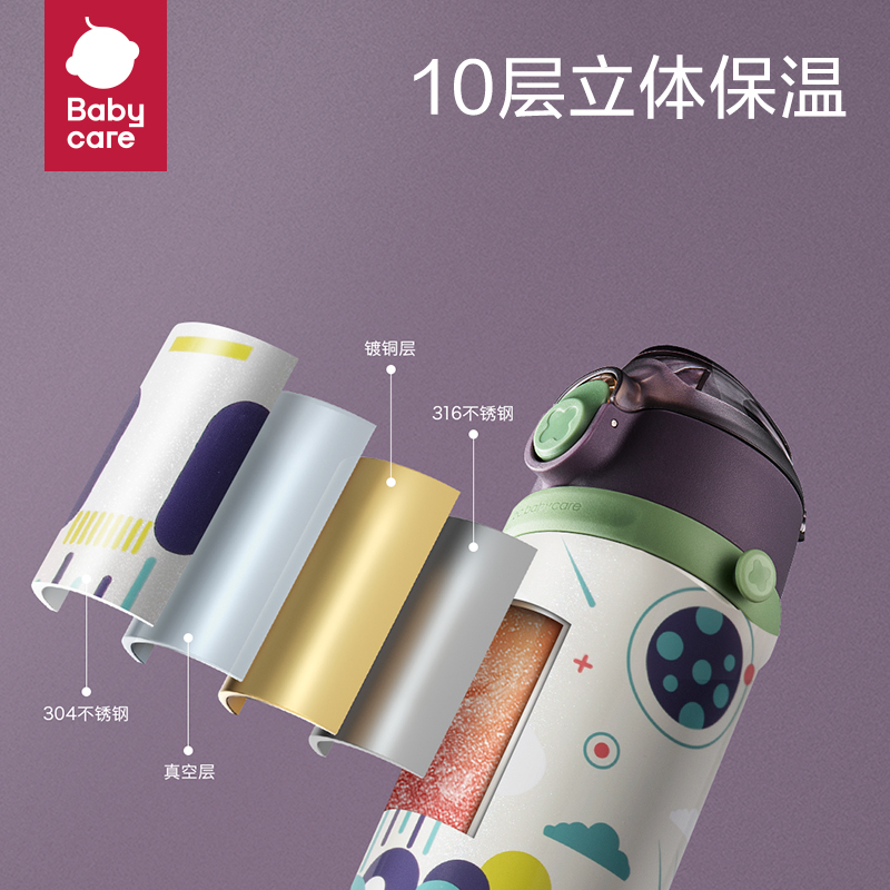 babycare RWA003-350A 儿童吸管保温杯 背带款,可自主调节水流量;食品级硅胶,安心入口杯盖+杯底均采用耐冲击PP材质,通过满水安全跌落测试,无惧小意外