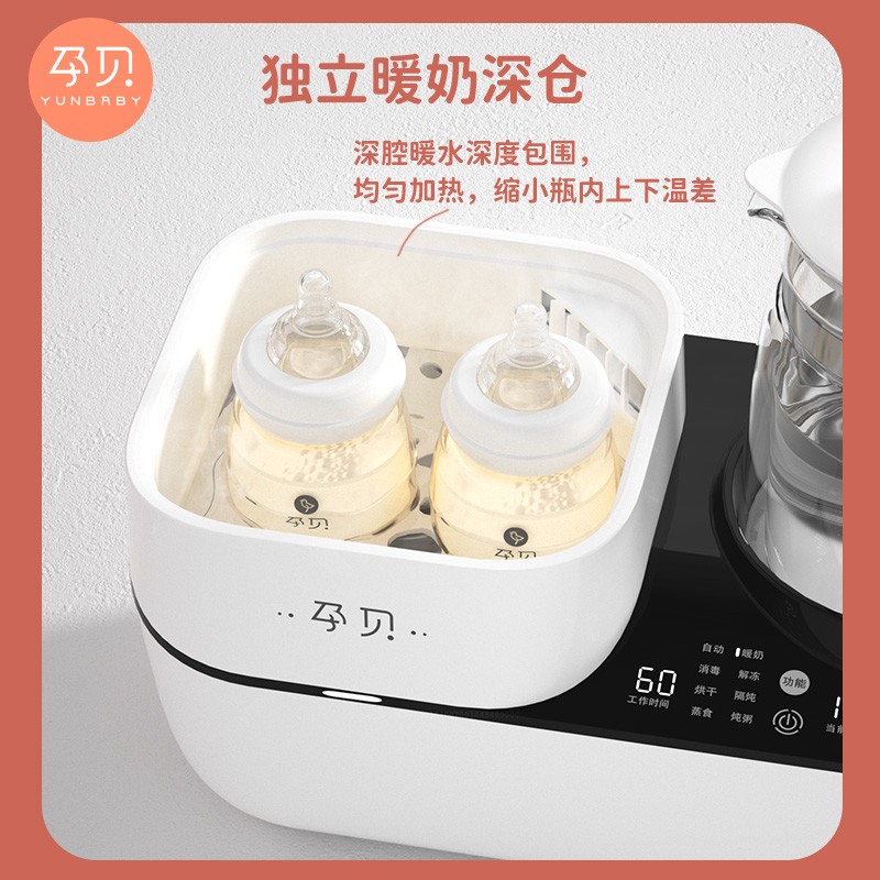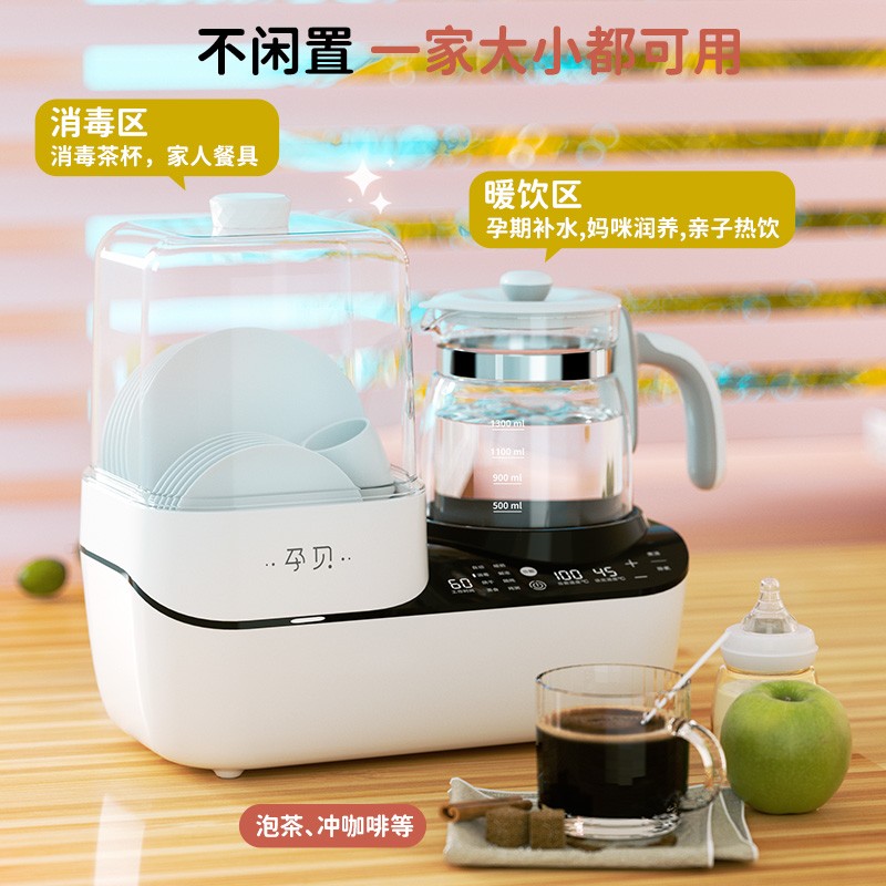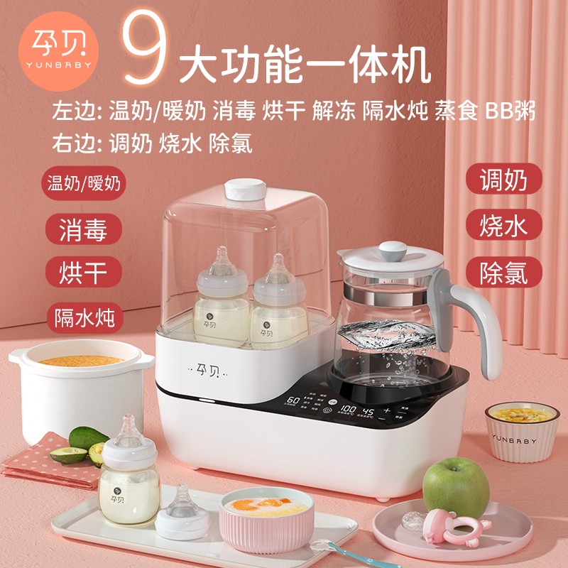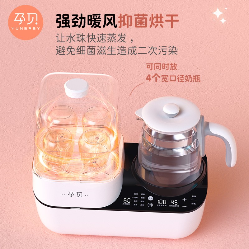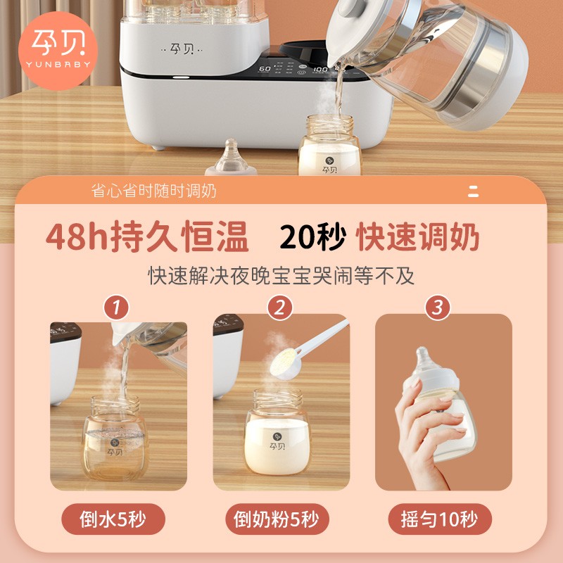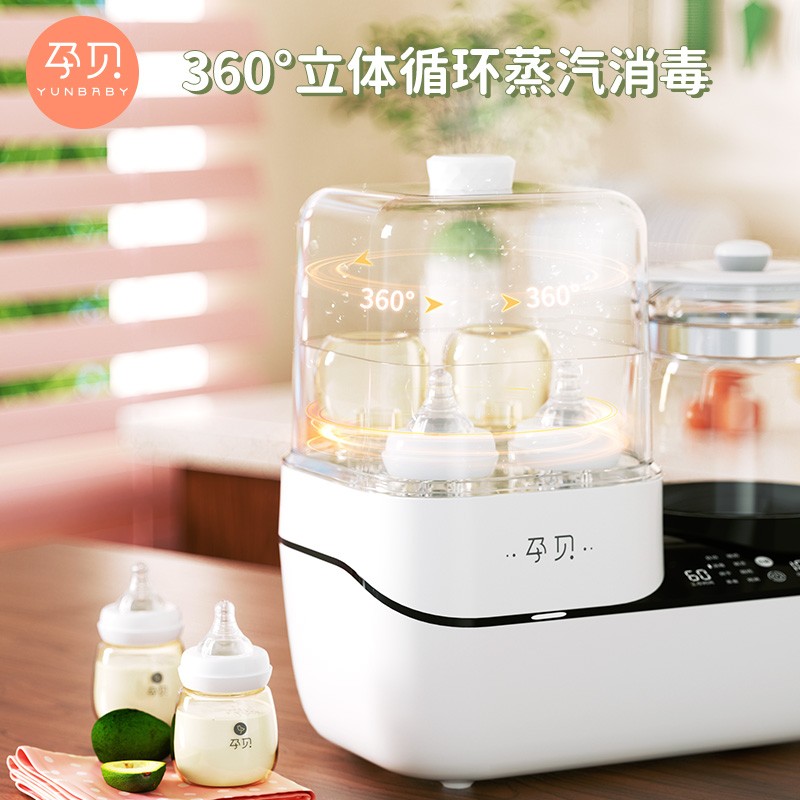 孕贝(yunbaby)这款二合一调奶消毒器,调奶和消毒左右分区,可单双边独立操作。消毒器立体循环蒸汽消毒搭配热风烘干,高效灭菌的同时避免水渍残留引起细菌滋生。调奶器采用1.3L大容量壶体,可满足多人饮水需求。具有48小时恒温调奶功能,设定好调奶温度,方便随时冲泡奶粉。尺寸为340*170*350mm。