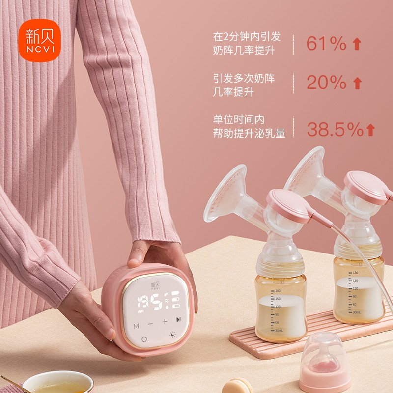 新贝为英国新贝婴儿有限公司旗下品牌,在国内知名度较高,其产品线比较丰富,主要包括婴幼儿奶瓶水杯、消毒器、暖奶器、吸乳器、调奶器、婴儿营养辅食器具等。很多产后妈妈面临着开奶困扰,如果开奶这步没做好,宝宝可能会拒绝母乳,妈妈也可能会因奶水不足产生奶涨和奶结等问题,这款新贝8775电动吸奶器主打的卖点是智能双变频技术能够深度模拟宝宝吮吸节奏,按摩疏通乳腺,帮助妈妈们在舒适状态下排出初乳。采用双韵律科技,开机后先是泌乳模式,充分按摩刺激乳腺,引发奶阵,手动转化为吸乳模式后,缓吸缓放一次吸空,帮助妈妈轻松排出高质量后奶,防止积奶和涨奶。两侧交替吸奶可以节省吸奶时间,也能避免吸一侧时另一侧溢奶,左右吸力相当,有助于排乳干净彻底。
