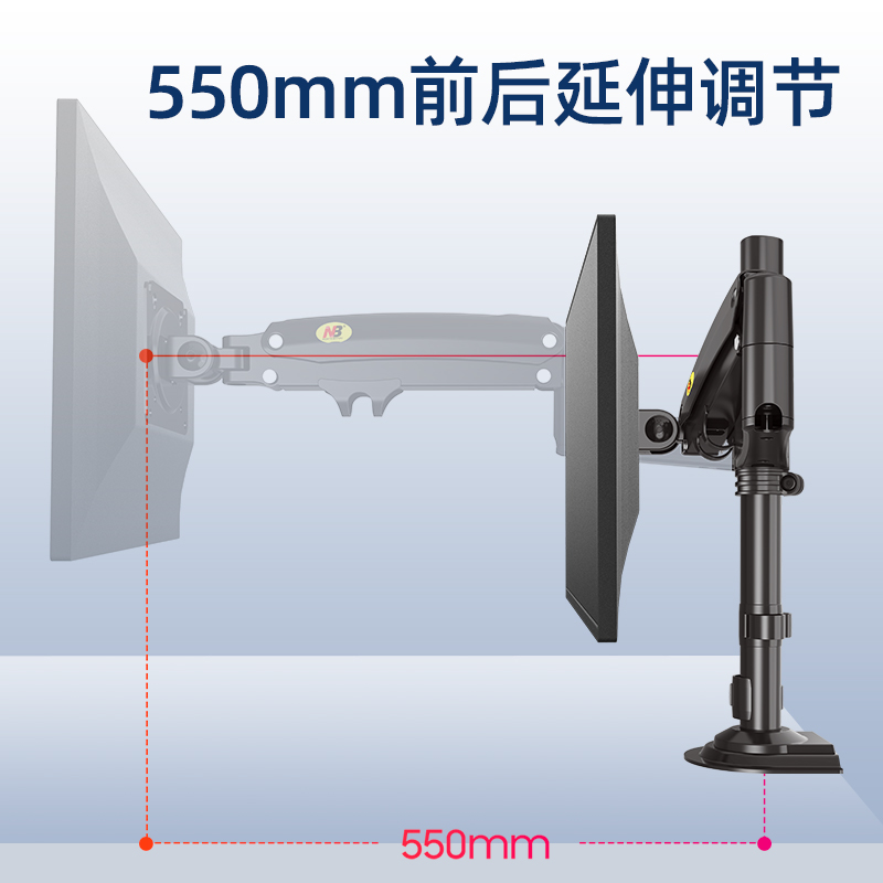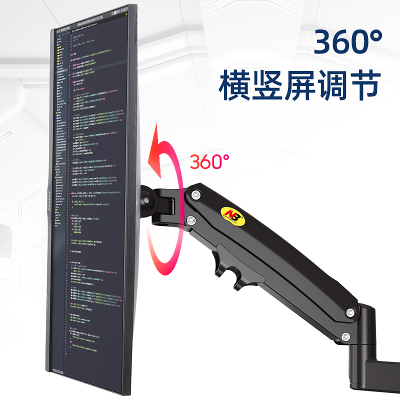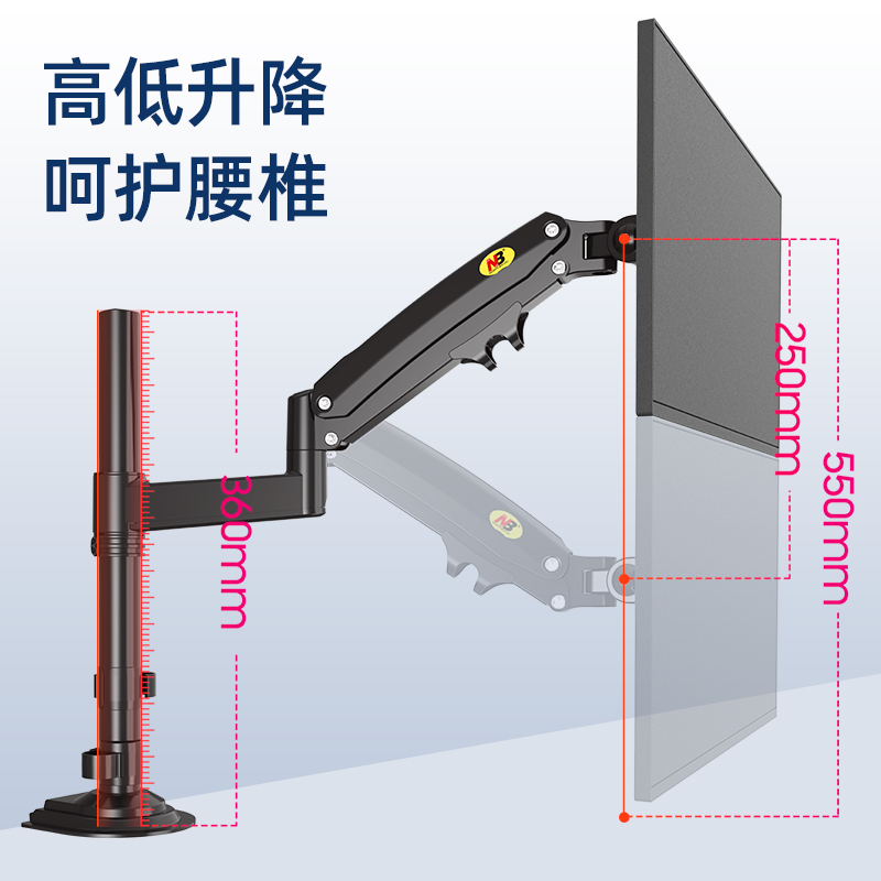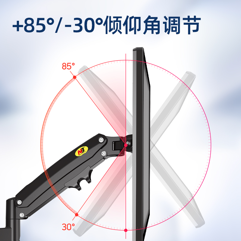 NB H100 显示器支架 立柱上下升降550mm高度调节,大屏优选,横竖屏自由切换。同时手臂嵌入气压式弹簧,伸手即停。立柱高度调节到顶部时,显示器中心位置到桌面可达到550mm距离。+85°/-30°大角度的倾仰角调节。左右180°转角,360°轻松旋转即可横竖屏切换,不再受屏幕限制。 三轴旋转角度任意调,阻尼加压结构,进一步提升屏幕旋转、升降、拉伸的手感。气弹簧压力调节,每台显示器的重量不同,需要的力值也不同,可根据需求增加或者是减小力值,从而达到自由悬停。 一体成型挂孔式面板,一人即可完成屏幕安装。气压悬停2-12kg动态承重,无极调节更稳定,经50000次疲劳测试。孔距75*75 100*100。