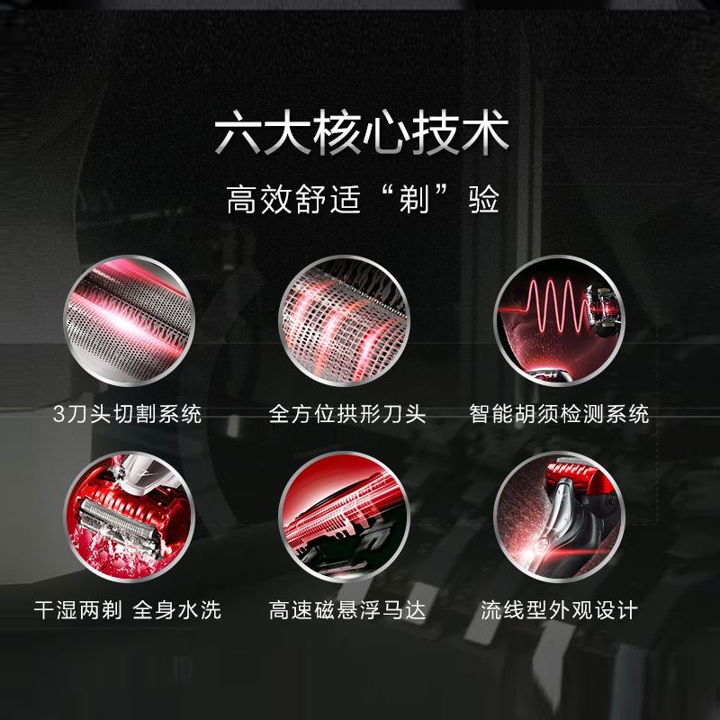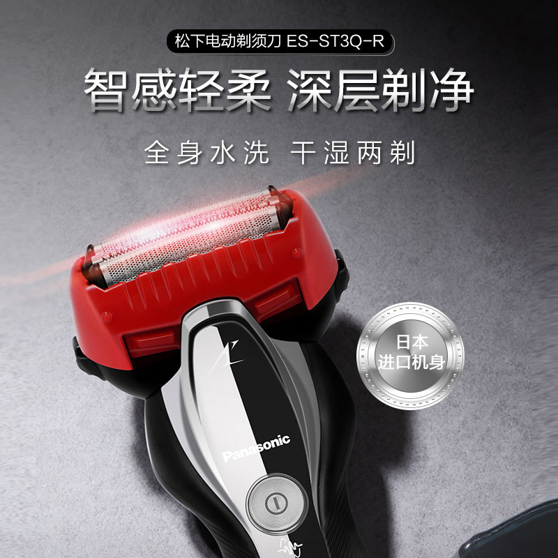 ST3Q款 马达驱动方式13000cpm磁悬浮马达,智能胡须检测系统,世界通用电压设计,充电时间1小时剃须时间:45分钟左右,带有7分钟快充功能,充电座充电,三刀头设计,支持全身水洗,机身日本进口,包装盒和充电器国产。