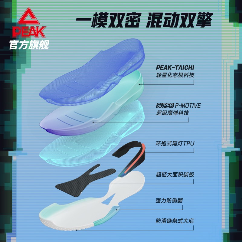 匹克闪现3代篮球鞋针对消费者的建议,将鞋楦和球鞋重量处理方面进行了一番大改。直接选用了全新鞋楦打造鞋款,将其变得更窄、更扁、更合脚,全面提升球鞋的实战质感。匹克设计师大胆采用“一模双密”全新中底,将匹克旗下的「超级魔弹科技」与「轻量化态极科技」进行融合,前掌魔弹科技主掌反馈,后掌态极科技主掌缓震。并且成功将41码鞋款减重到350g。