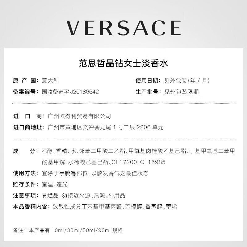 ERSACE(范思哲)是著名意大利服装品牌,由詹尼范思哲于1978年创立。这款VERSACE 范思哲 晶钻淡香水,前调散发着清新甜美的果香味,随之而来的浪漫优雅的花香,最后充盈着温暖细腻的木香。层次丰富,别具魅力,诠释着优雅感性且具有个性的女人气质。