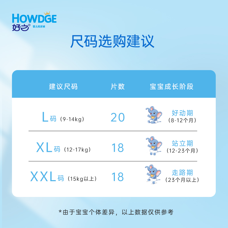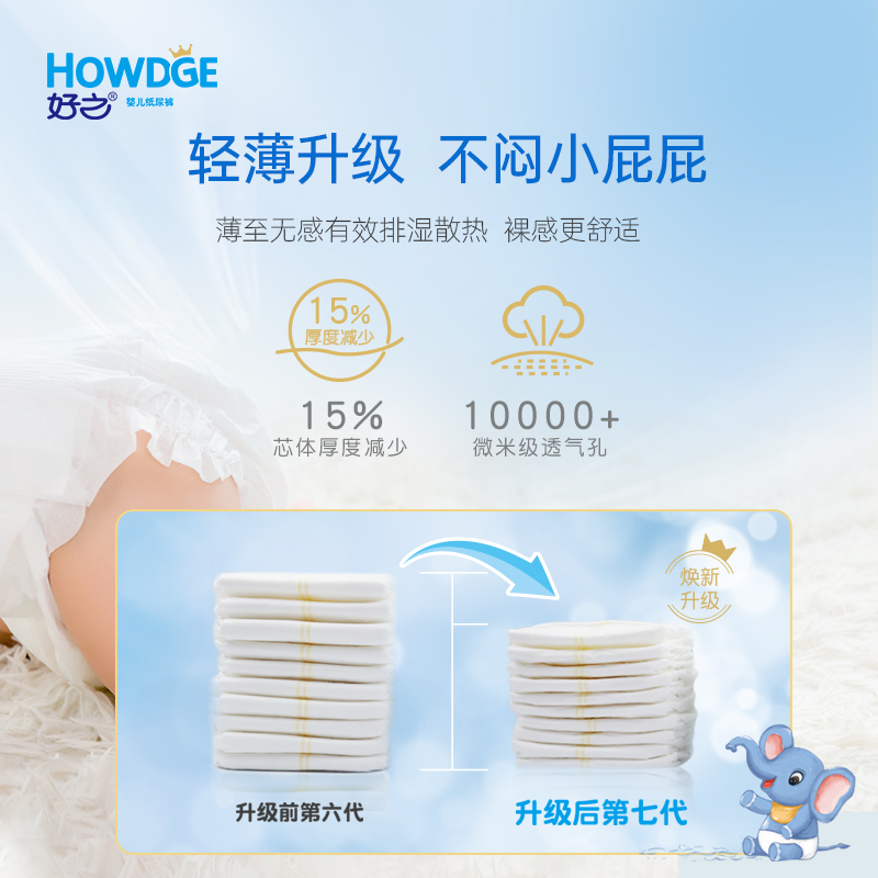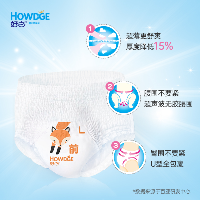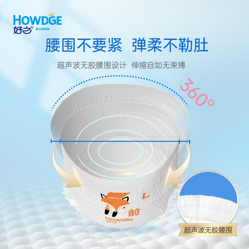 好之是国产纸尿裤品牌,从事妇婴卫生用品的研发、生产和销售,2012年创立于重庆,线上线下双线入驻,拥有现代化产业基地和专业生产线,采用全球优质原材料,提供高品质纸尿裤。这款轻呼吸不要紧系列拉拉裤采用轻薄全芯体结构,瞬吸锁水,减少拉拉裤起坨断层问题,表层拥有无数透气微孔,快速排出闷热湿气,屁屁时刻清爽,选用无束缚弹力腰围,柔软贴身不勒肚肚,加宽臀部剪裁,小屁屁不紧不闷,贴合宝宝腿部的护围设计不紧绷不漏尿,好动宝宝无拘无束。
