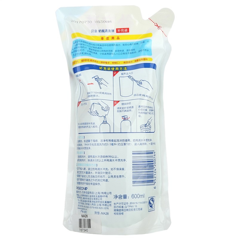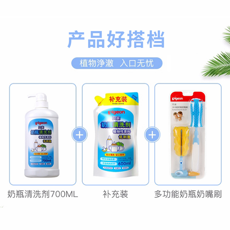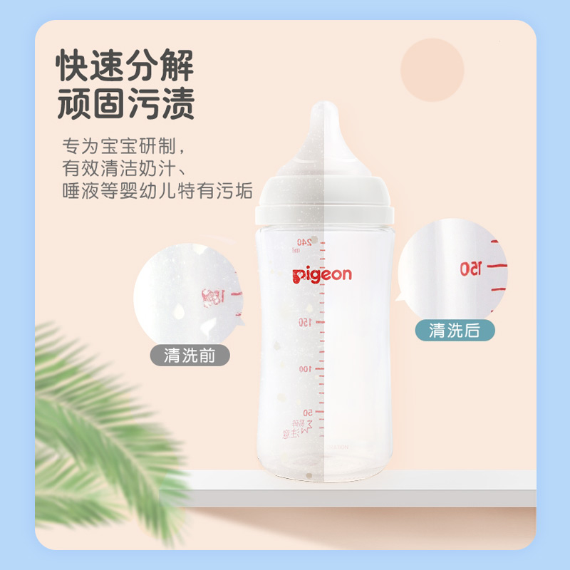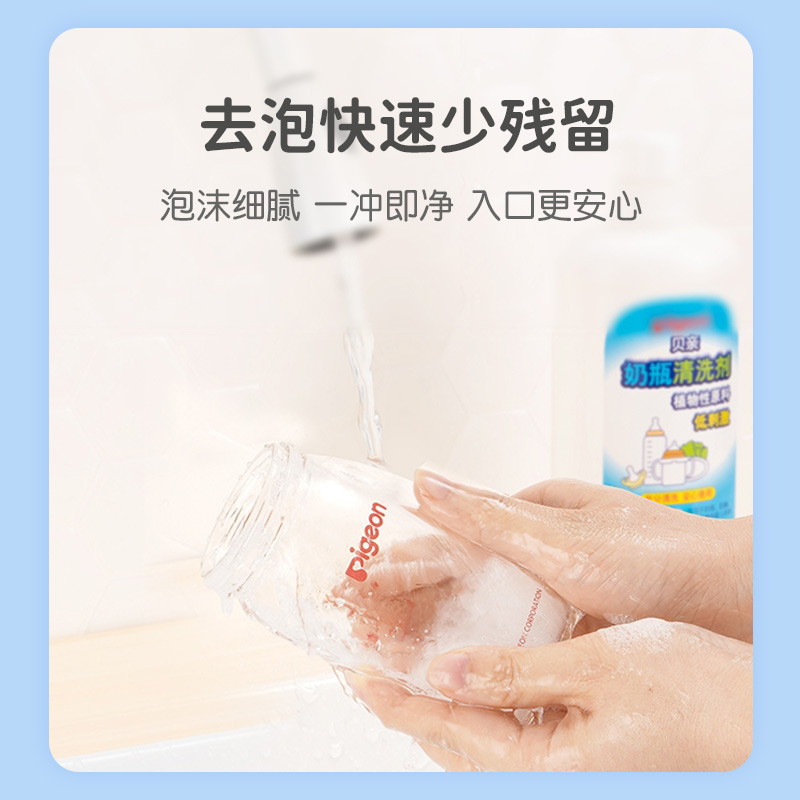 Pigeon/贝亲 奶瓶清洗剂,蕴含植物的清洗成份和食品中也使用的成份,能安心用于奶瓶、奶嘴、小玩具等婴幼儿入口之物的清洗。 有效清洗奶渍、唾液等婴幼儿特有的污垢,去泡快速,漂洗容易。 弱酸性配方,对哺乳器具,小玩具等婴幼儿入口之物无影响,温和不伤手。 规格:700ml