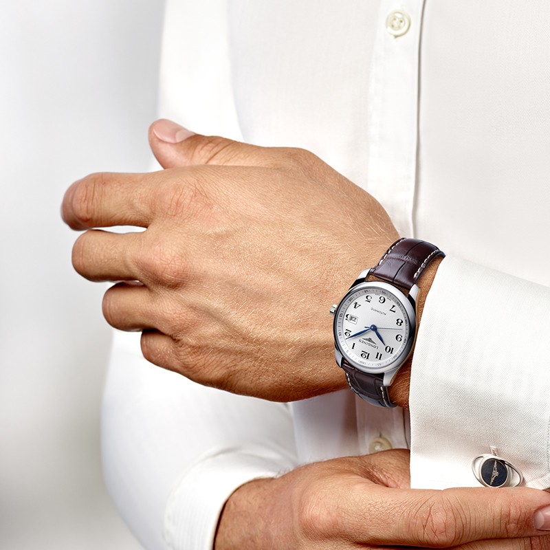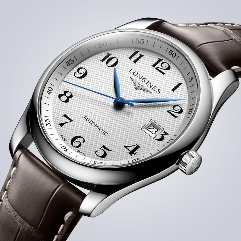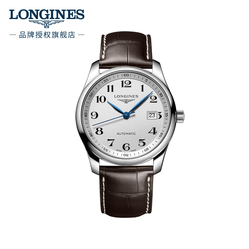 LONGINES 浪琴 名匠系列 40毫米自动上链腕表,搭载L888自动上链机械机芯,每小时振动25200次,动力存储可达72小时,银色“麦粒”饰纹表盘搭配蓝钢指针,3点钟位置设日期显示窗口,漆绘阿拉伯数字时标,合成蓝宝石表镜,透明表背,防水深度30米。