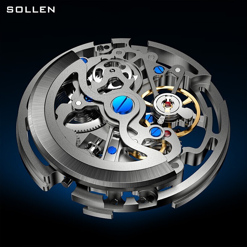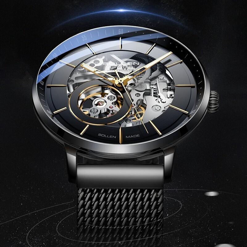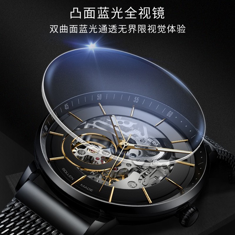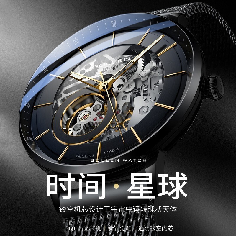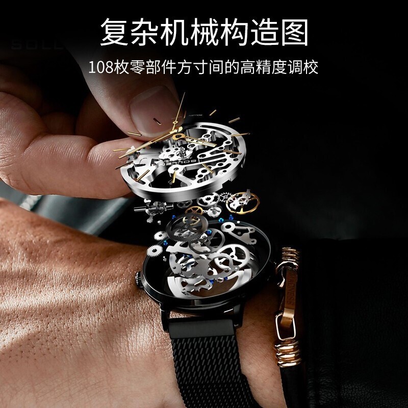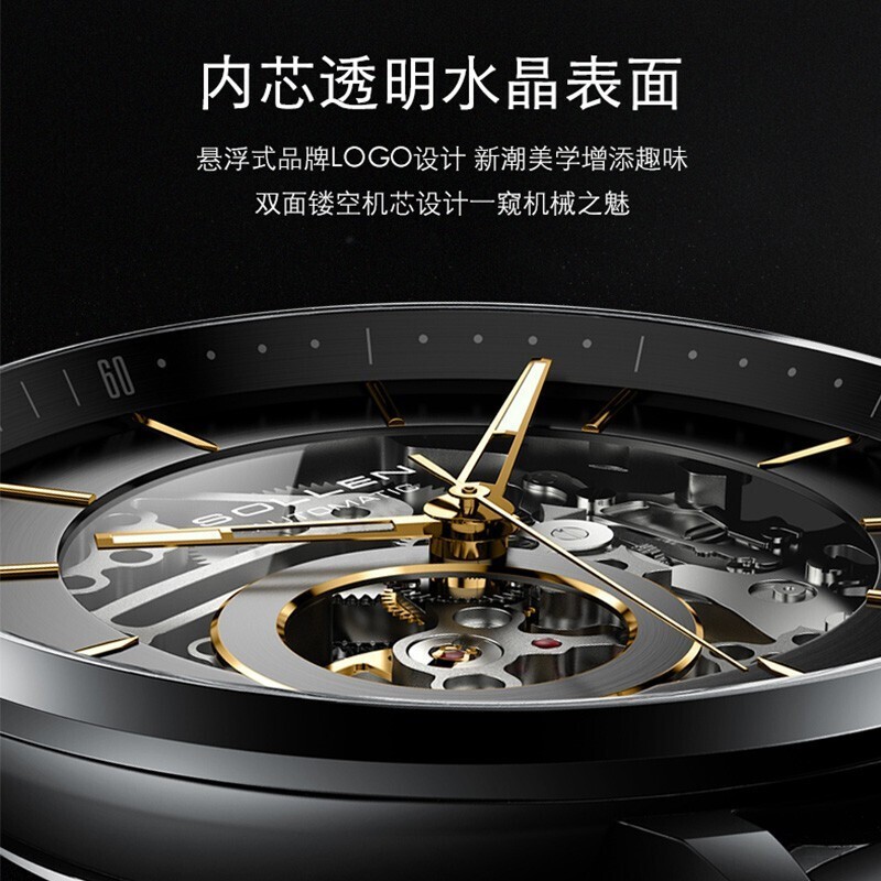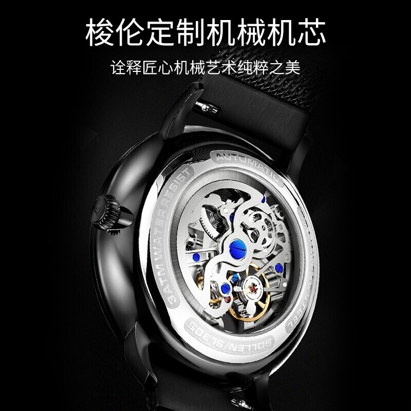 梭伦(SOLLEN)推出的这款42毫米腕表,搭载机械机芯,走时稳定。具有3ATM防水性能,满足日常防水需求。采用人工合成蓝宝石表镜,耐磨损且通透性好,读时清晰。圆形镂空表盘配有条状时标、大三针,简约大气。