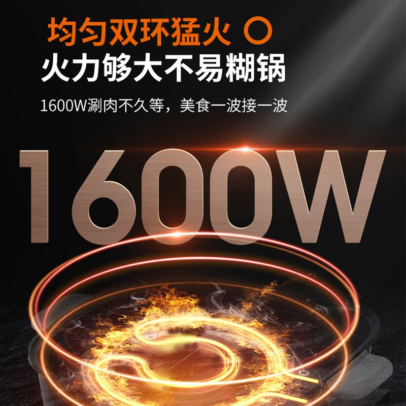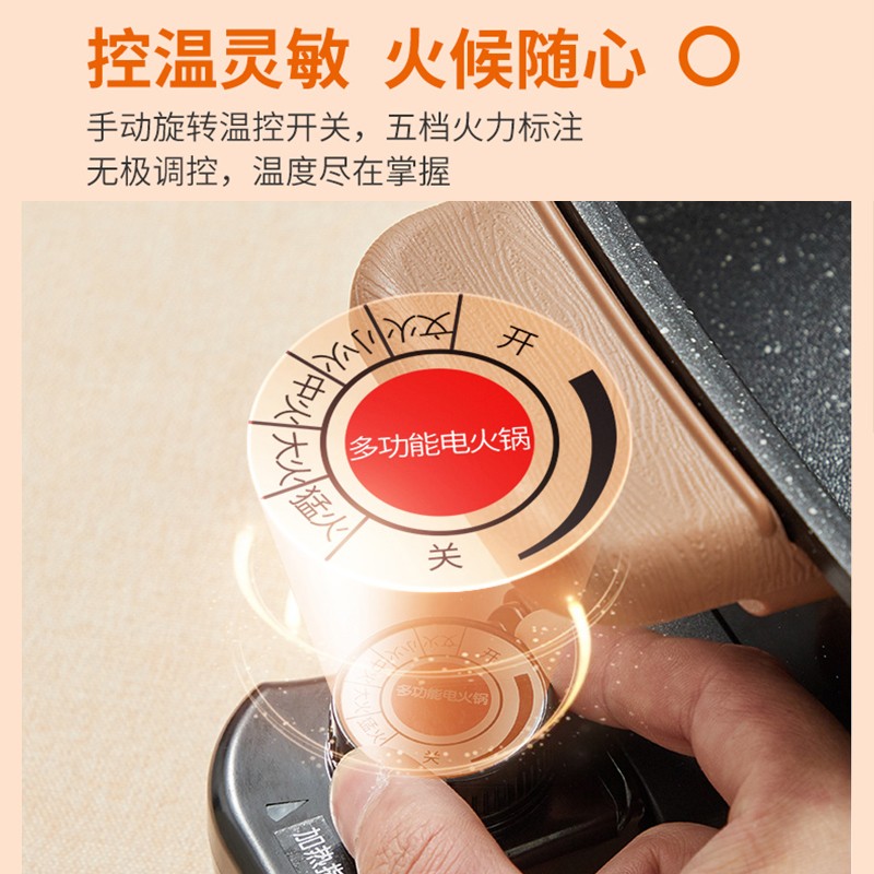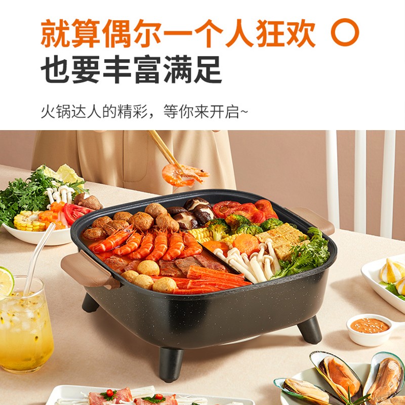 九阳家用多功能电火锅,1600W强大火力,温度尽在掌握,自动再加热,干烧时,过热断电保护,智能控温,火候随心调控,6L大容量,省时省力。