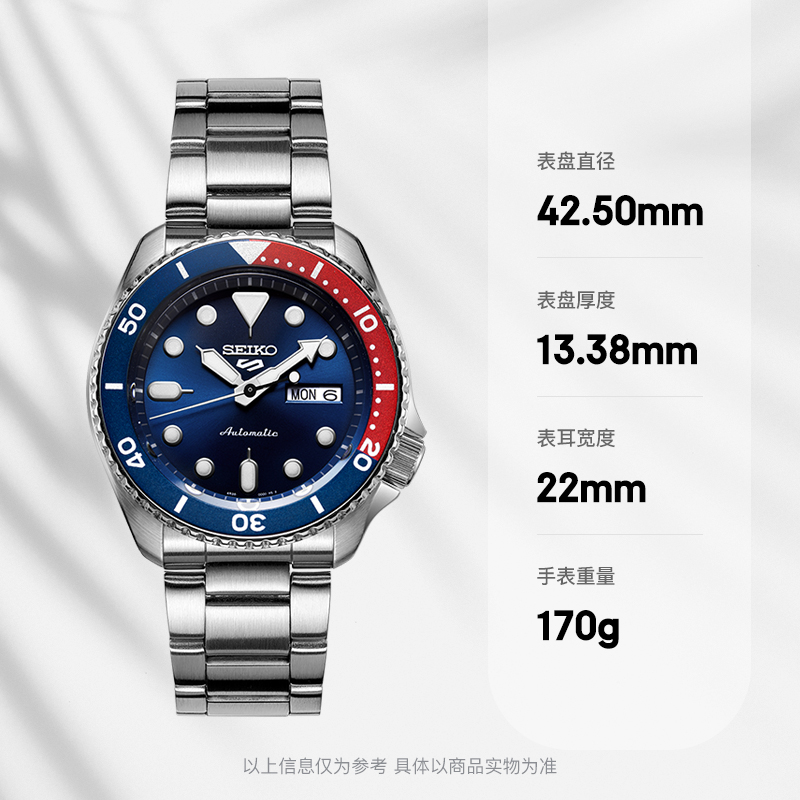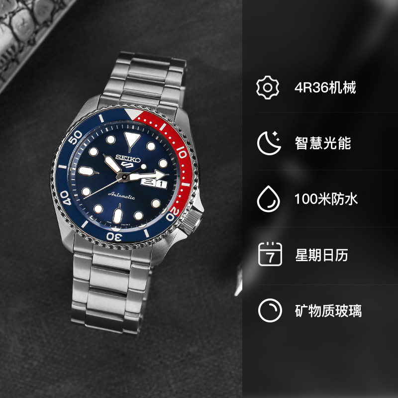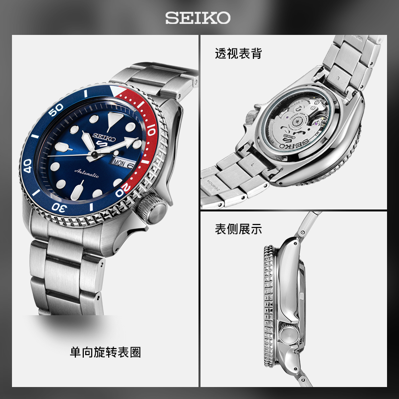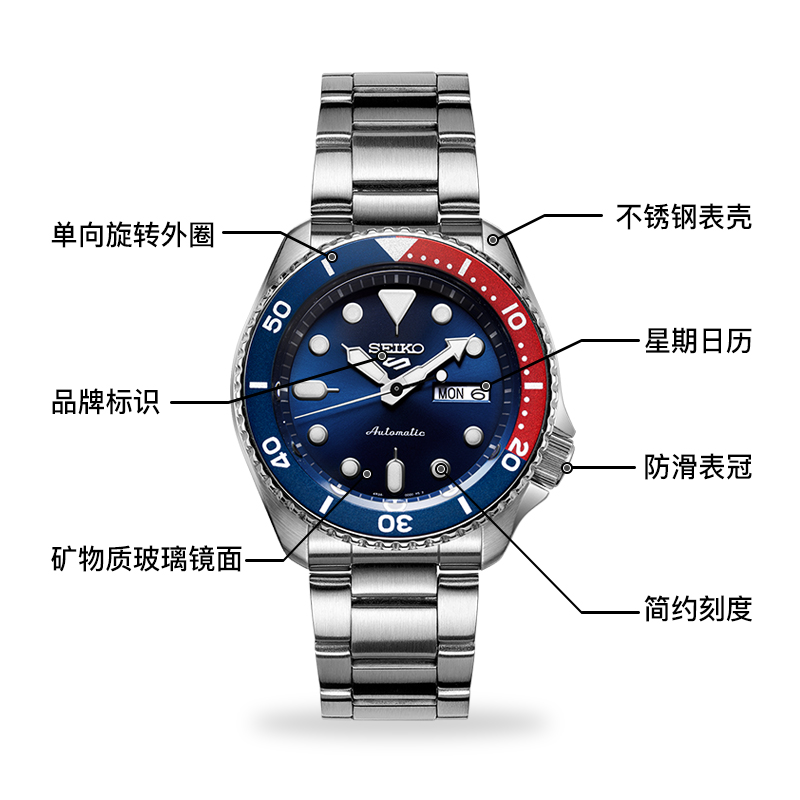 这款货号为SRPD83K1 男士自动机械手表是一款潜水腕表,采用机械机芯,不锈钢表壳,直径为42.5mm,厚度为13.38mm,表镜采用矿物玻璃,单向旋转表圈,支持100米防水。夜光指示功能可以在暗黑的水下把握时间,轻松读时。