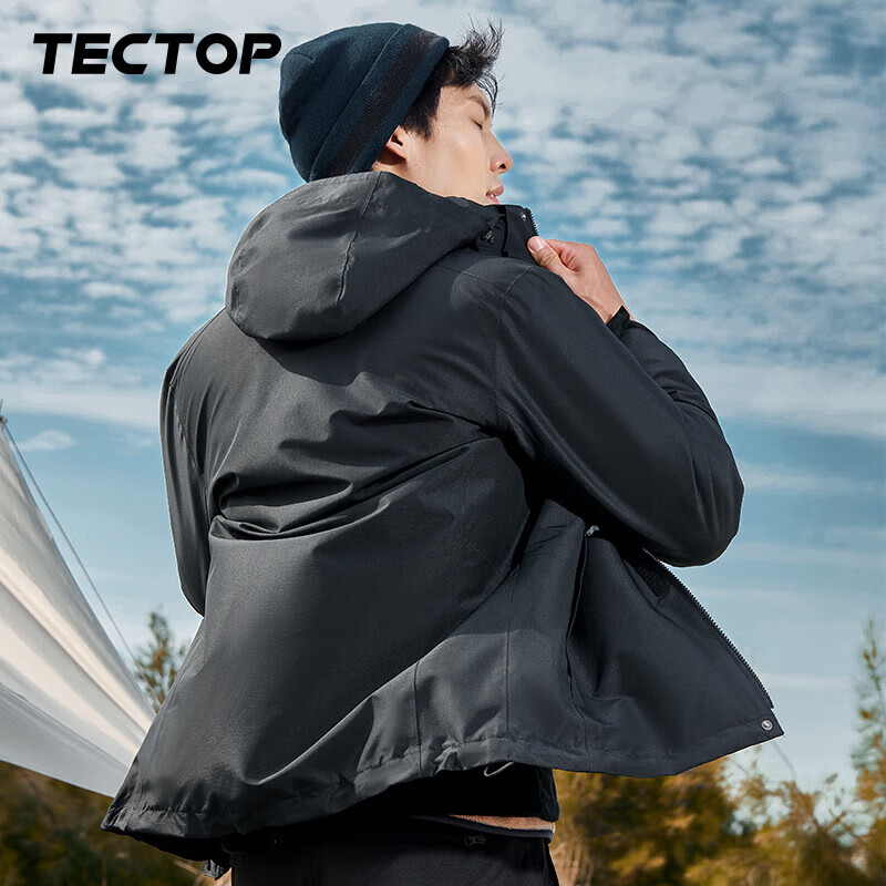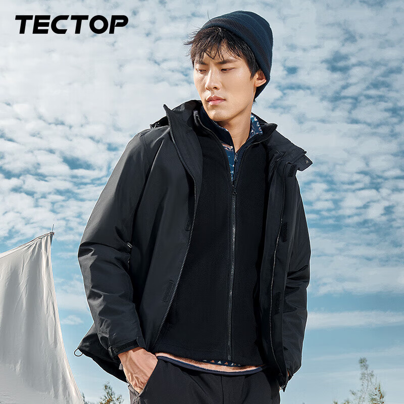 TECTOP 探拓 D207277CF 情侣款三合一冲锋衣,外层经过防泼水处理,中层再加科技防泼水透气膜,多重防泼水,冲锋衣耐水压值过5000MM/H₂O,水珠落在衣表会聚集滑落,有效阻止水分子渗入,可抵御大雨侵袭,持久防泼水防油污。采用3D结构构建的三防体系,防风效果显著,能有效阻隔冷空气对身体的侵袭,强力防护,防风御寒。