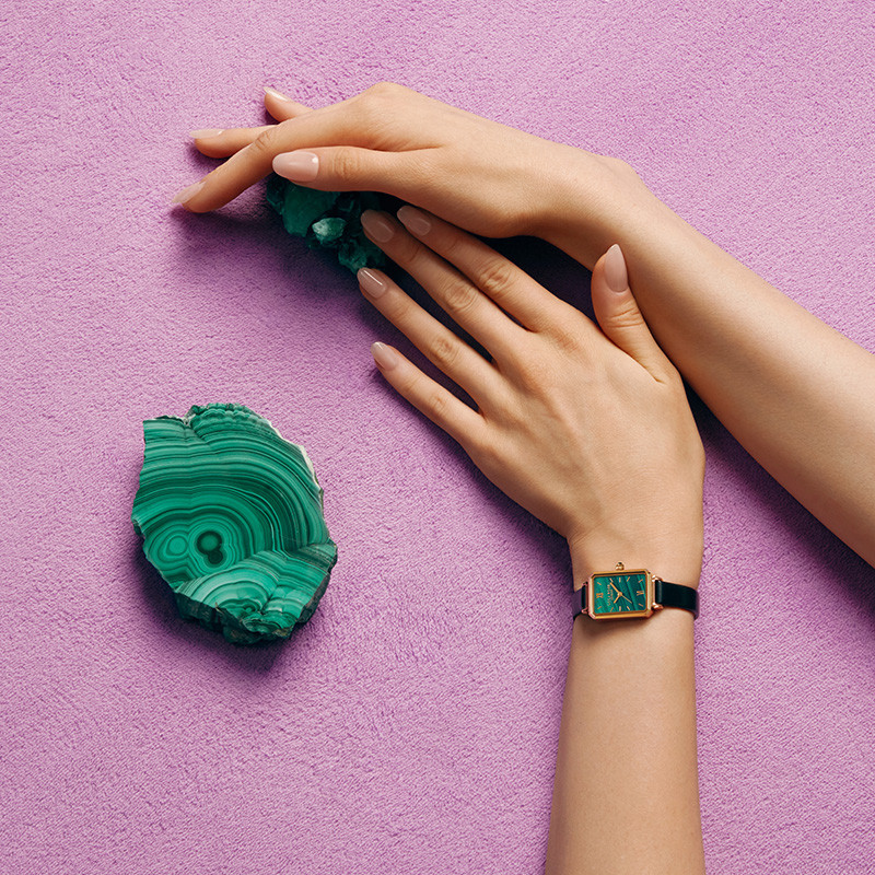 以孔雀石纹理与方盘设计,构建小绿表经典形象,塑造时间抹不平的棱角,撷取孔雀石的绿色点亮腕间色彩,寄托对于幸运的祈愿,演绎个性与优雅的融合。Lola Rose 是来自英国的珠宝品牌,品牌由英国珠宝设计师 Nikki Gewirtz 在 2000 年创立于伦敦。在产品设计方面,Nikki 突破传统设计理念,将天然的多彩宝石元素融入到腕表设计之中。