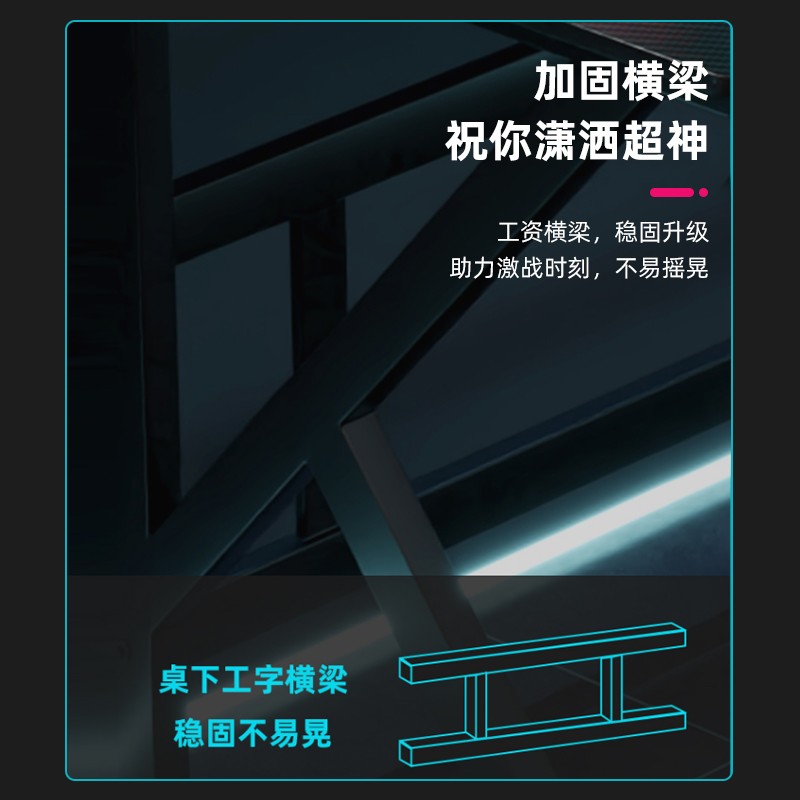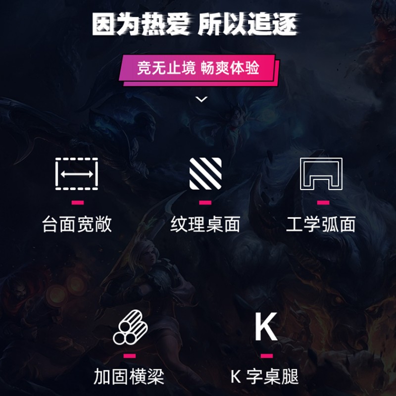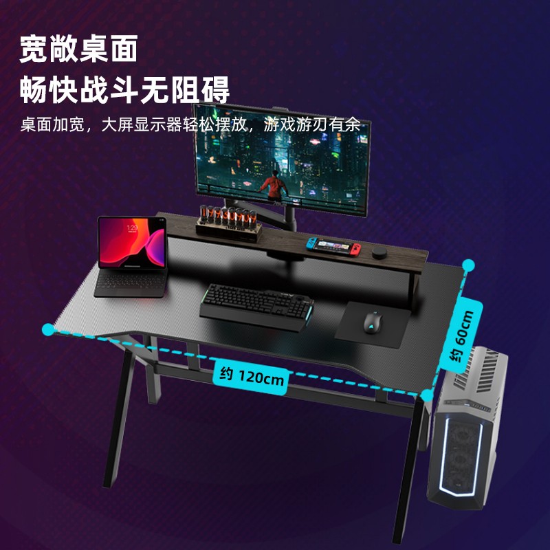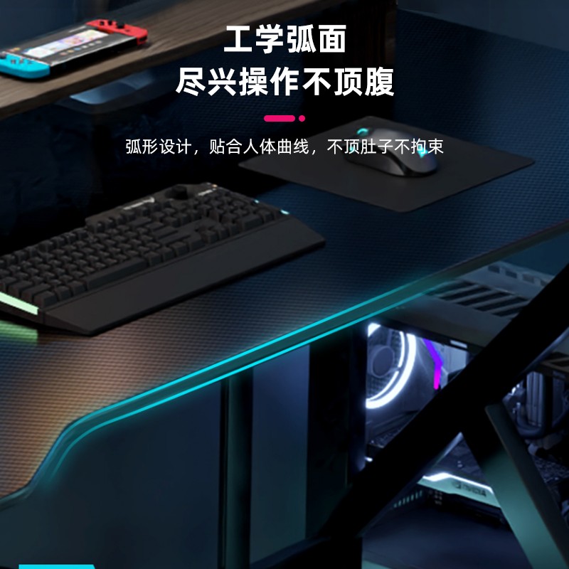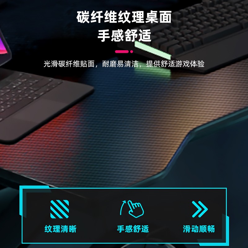 光滑碳纤维贴面,耐磨易清洁,提供舒适游戏体验。弧形设计,贴合人体曲线,不顶肚子不拘束。桌面加宽,大屏显示器轻松摆放,游戏游刃有余。