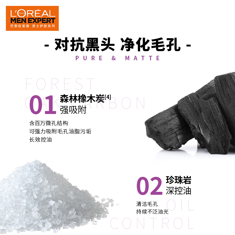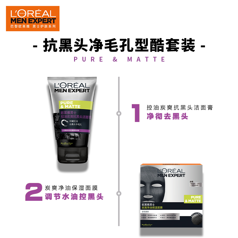 L'OREAL PARIS(欧莱雅)来自法国的彩妆护肤品牌,创立于1907年,是欧莱雅集团旗下大众化妆品牌之一,主要生产染发护发、彩妆及护肤产品。这款 L‘OREAL PARIS 巴黎欧莱雅 男士控油炭爽洁面套装,包含男士控油碳爽洁面膏100ml*2瓶、洁面50ml*2瓶、男士面膜2片。专为男士设计,可有效清洁控油,净化毛孔,帮助去除黑头。