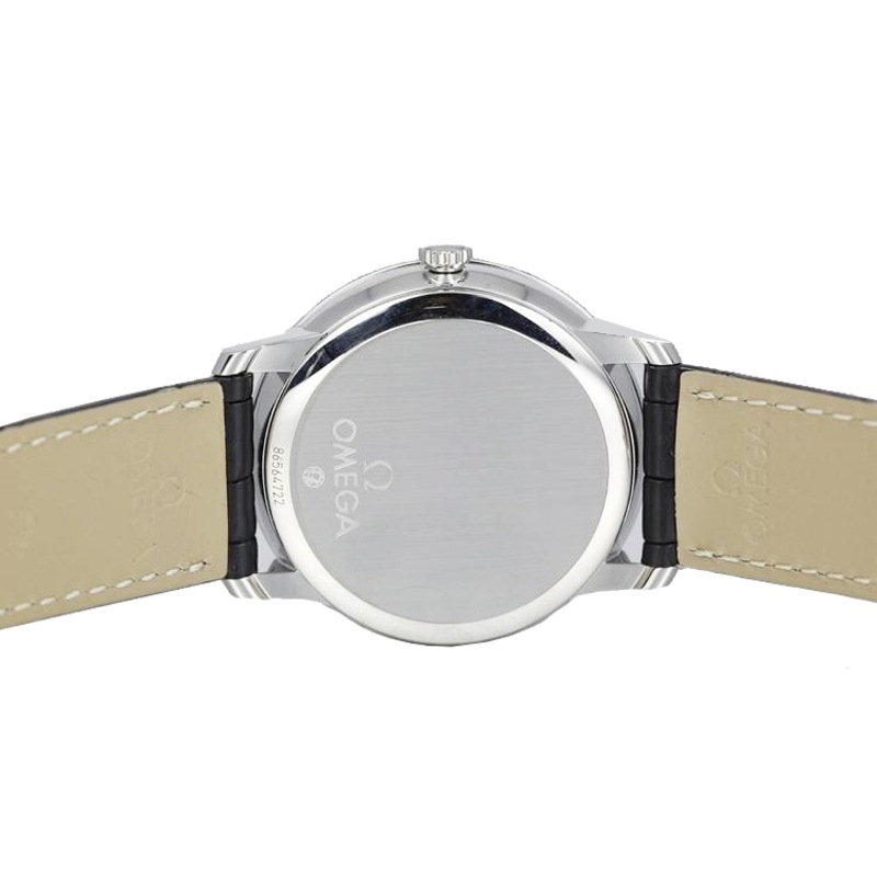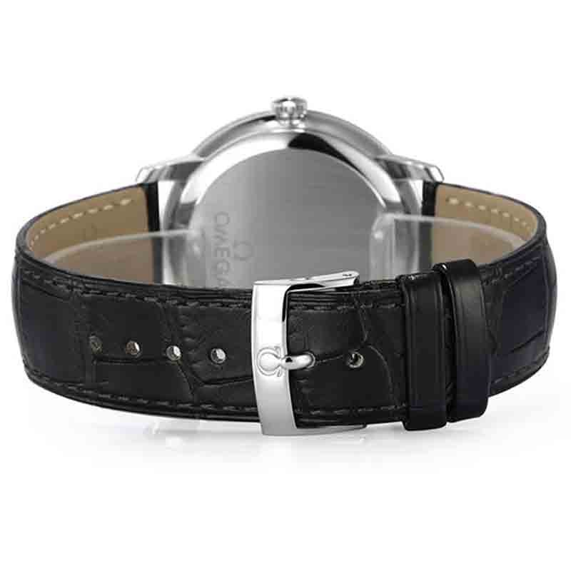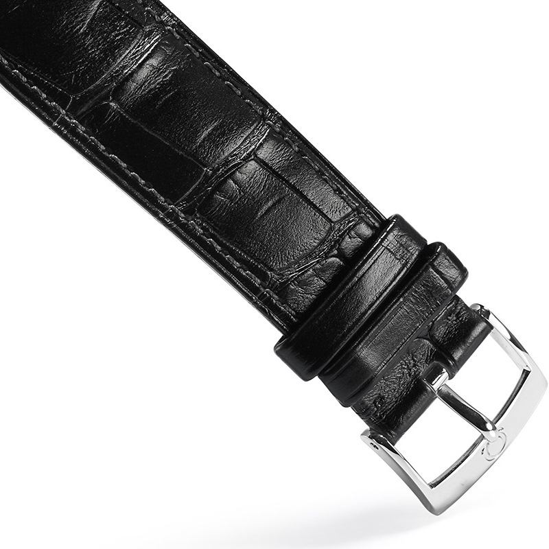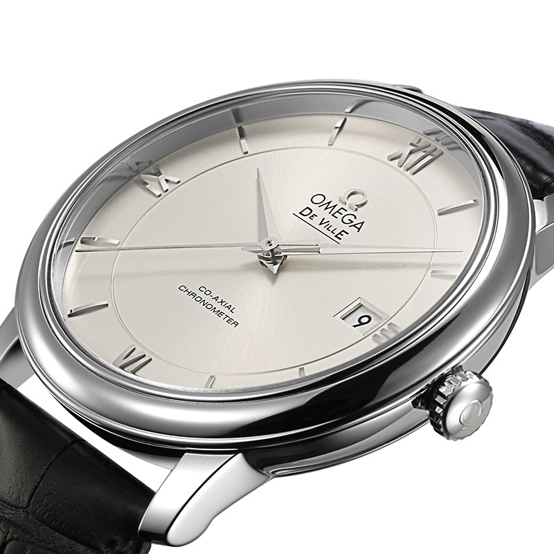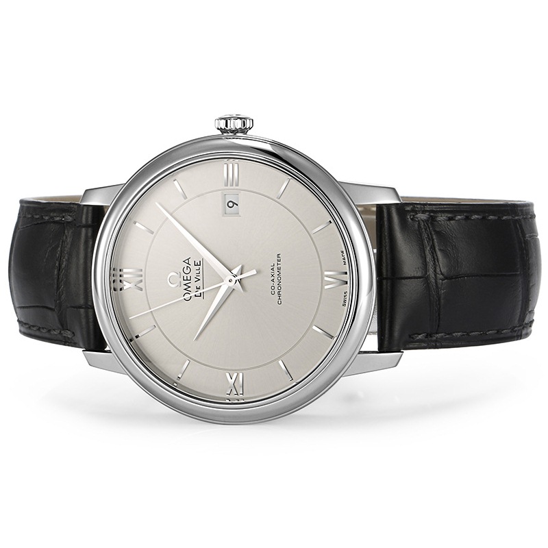 此款腕表采用银色同心圆表盘,3、6、9及12时位置饰有罗马数字小时刻度,3时位置设有日历窗口。耐磨损蓝宝石玻璃表镜为此耀目表盘提供周全保护。39.5毫米精钢表壳搭配黑色皮表带,内部则搭载有欧米茄2500同轴机芯。