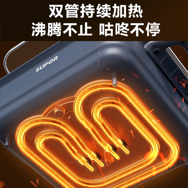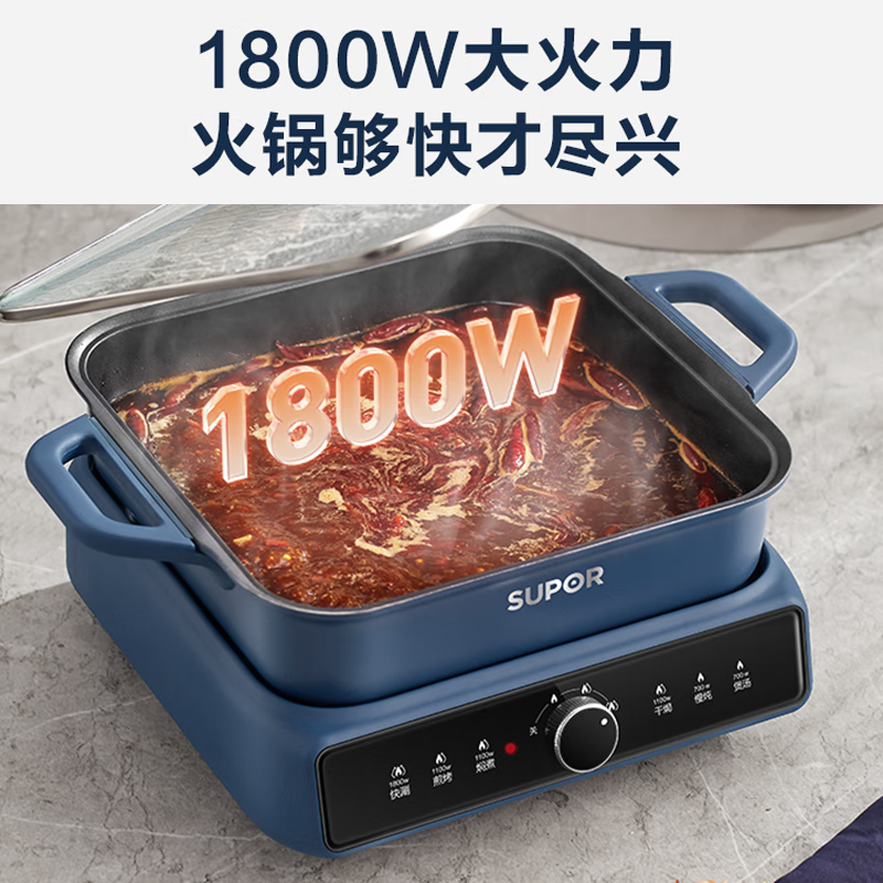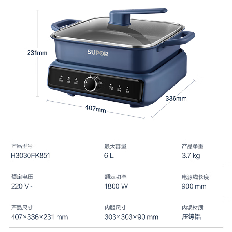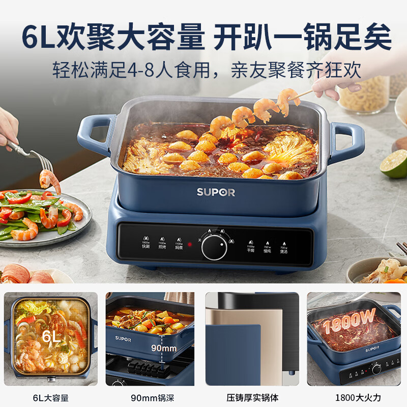 SUPOR 苏泊尔 H3030FK851 家用多用途锅 6升 分体式设计,灵活分拆,直端上桌,轻松端上桌,畅食不受限,双管持续加热,沸腾不止咕咚不停,环绕锅底持续发热,受热面积大,1800W大火力,火锅够快才尽兴,猛火快速沸腾,即刻开涮。