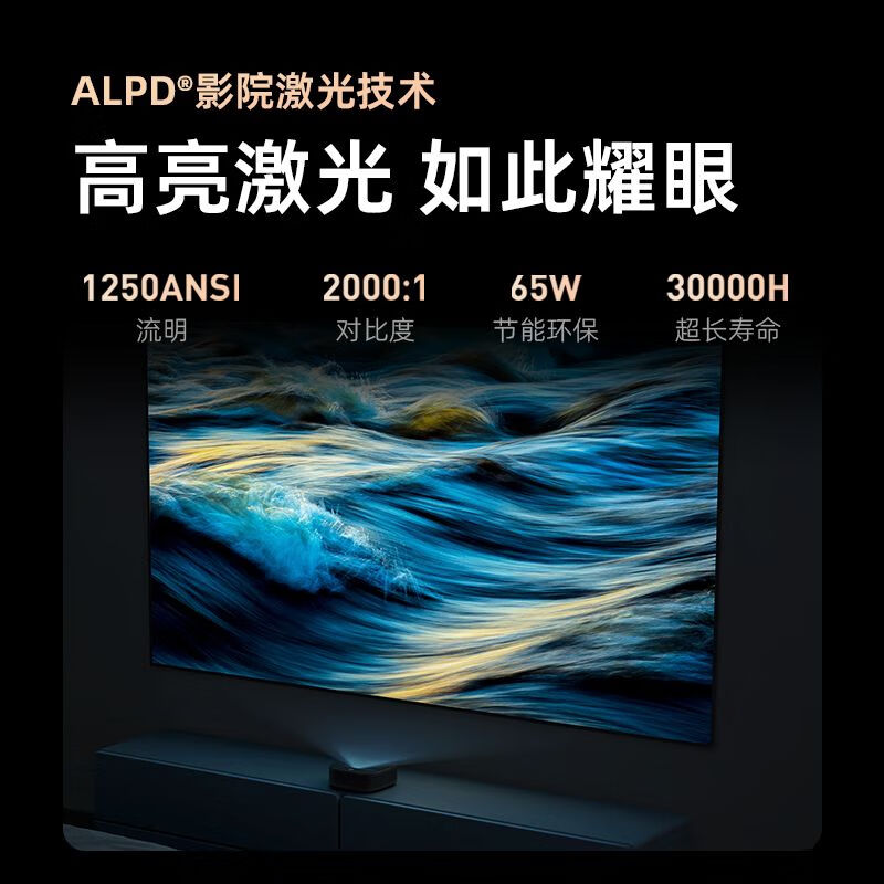 当贝 U1 使用ALPD低能耗激光光源,亮度高达1250ANS流明,亮度更高,能耗更低。支持1080P,采用投射比仅023:1的超短焦成像设计,贴墙仅需25cm便可投出80英寸的画面;稍远一些,34cm就能拥有100英寸巨幅画面。