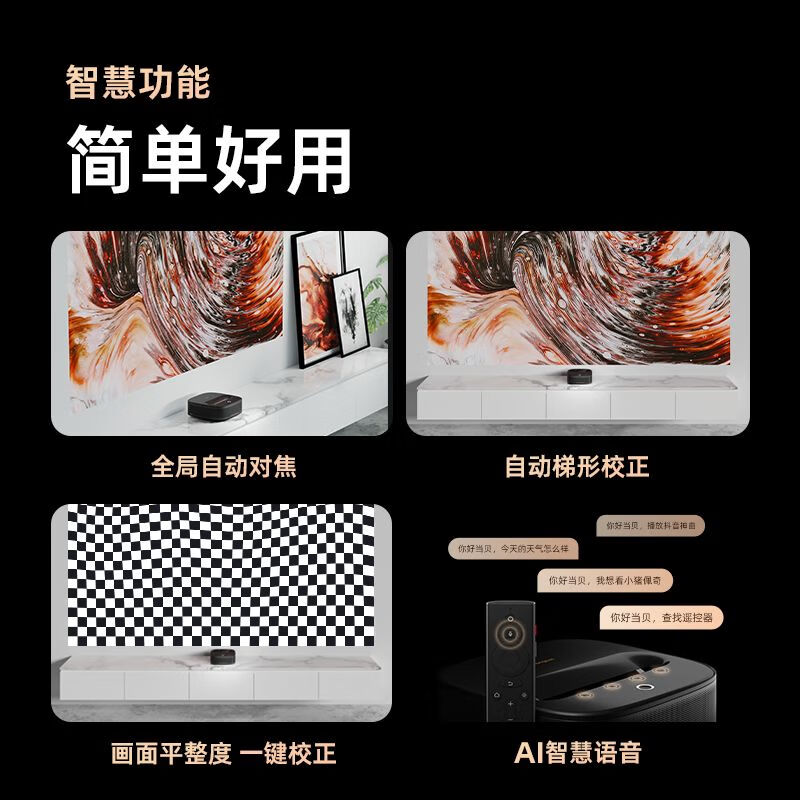 采用全局实时自动对焦,目光所及,画面鲜亮清晰;搭载2颗飞行时间传感器ToF,快速处理对焦程序,悄无声息。搭配自动梯形校正,通过敏锐的陀螺仪和TOF传感器,升级的空间几何算法,画面校正更快、更准,侧投也能得到方正画面。墙面不平,画面边缘会出现凹凸,当贝自研算法,手机拍一下即摆平,一键校正。在家轻松摆放,无需顾虑。