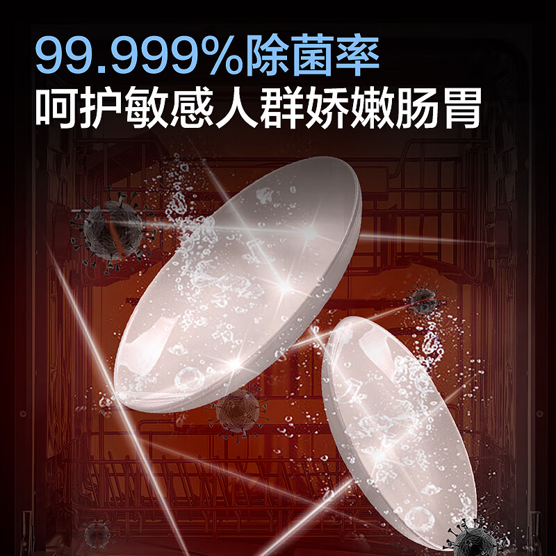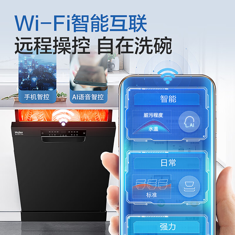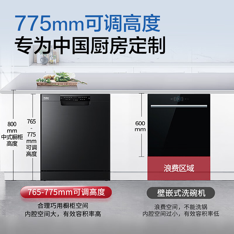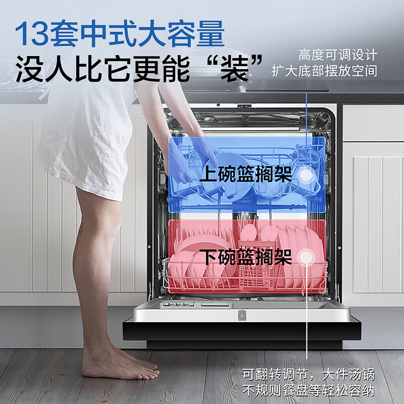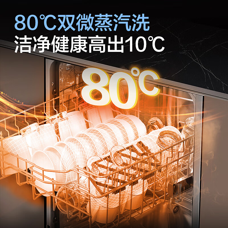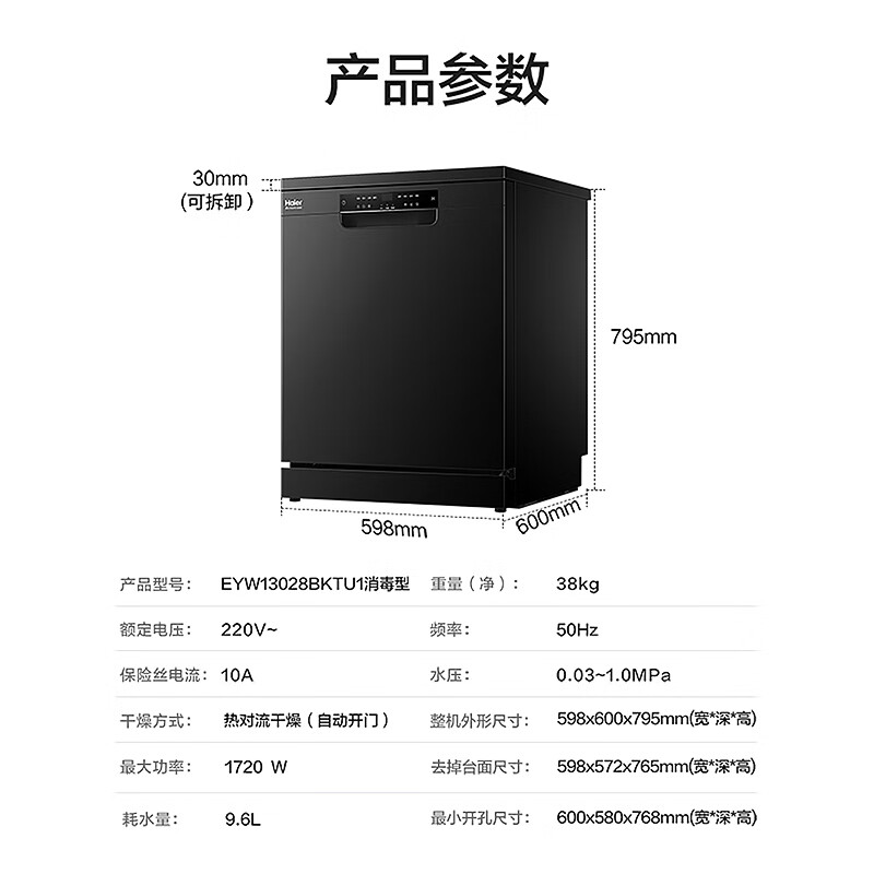 海尔EYW13028BKTU1洗碗机容量为13套,双层中式搁架设计,空间优化,取放更加便利。高度可调设计,扩大底部摆放空间。80℃高温微蒸汽远超同行业标准,有效净除餐具附着细菌,媲美国家二星级消毒柜标准,除菌率99.99%。智能探测温湿黄金平衡点,达到55℃自动开门。严防烫伤。8+6种智能洗涤程序。支持手机APP控制,搭载混浊一体传感器,智能感应餐具油污程度,匹配适宜的水温、时长。产品尺寸:598*600*795mm
