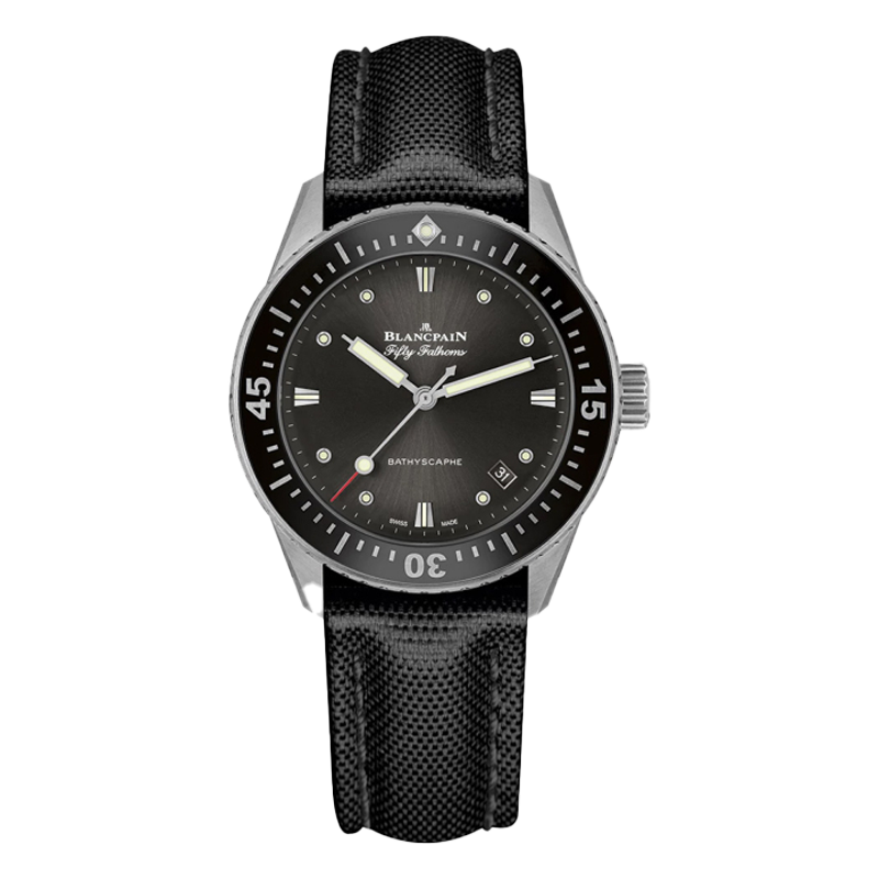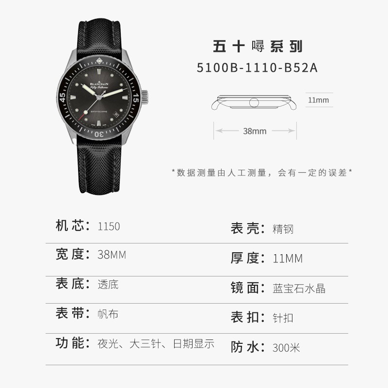 BLANCPAIN 宝珀 五十噚系列 男士自动机械表 5100B-1110-B52A,防水:300米,功能:日期显示,夜光,大三针,是一款靓丽的魅力单品。