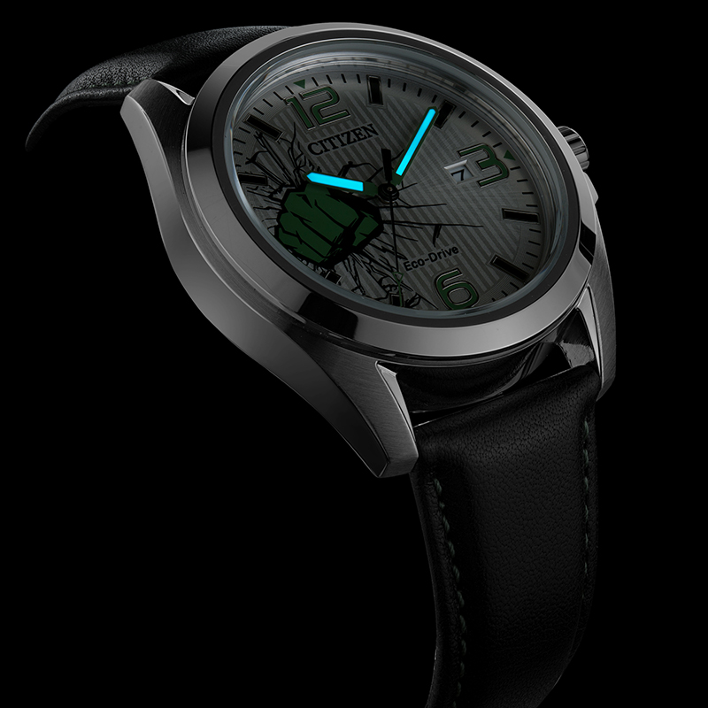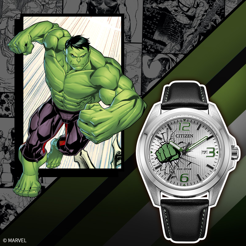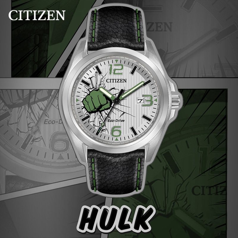 19年10月西铁城以全球最受欢迎的漫威漫画中的超级英雄们为设计主题,推出“西铁城×漫威”合作系列腕表,本系列合作款包括“蜘蛛侠”和“美国队长”等漫威人气角色,打造出极富个性的7款腕表。将每位英雄角色的标志性图标与配色完美融入腕表的细节当中,尽显漫威世界的独特魅力。此外,每款腕表均采用刻有超级英雄图标的定制表盒,个性化十足。本次以绿巨人为设计主题:将绿巨人的标志性拳头作为设计主题。拳头与裂纹的结合,展现浩克的力量,表盘上的阿拉伯数字刻度及表带缝线,均采用绿巨人的标志性颜色-绿色点缀,尽显绿巨人的独特魅力。3点位日历开窗,矿物质强化玻璃,搭配小牛皮表带,直径41mm