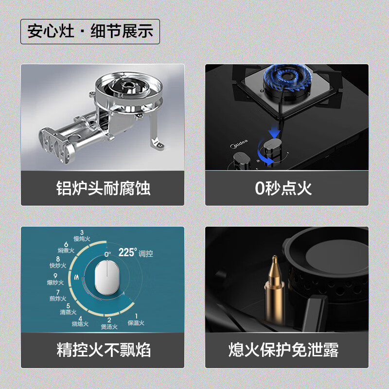 Midea 美的 厨趣系列 J50+Q230B 侧吸式烟灶套装 液化气。挥手经过感应点即可开关机,避免油腻双手弄脏面板,烟机时刻保持干净,895MM宽域拢烟屏,全面封锁升腾油烟,双灶齐开也照样吸得干净。