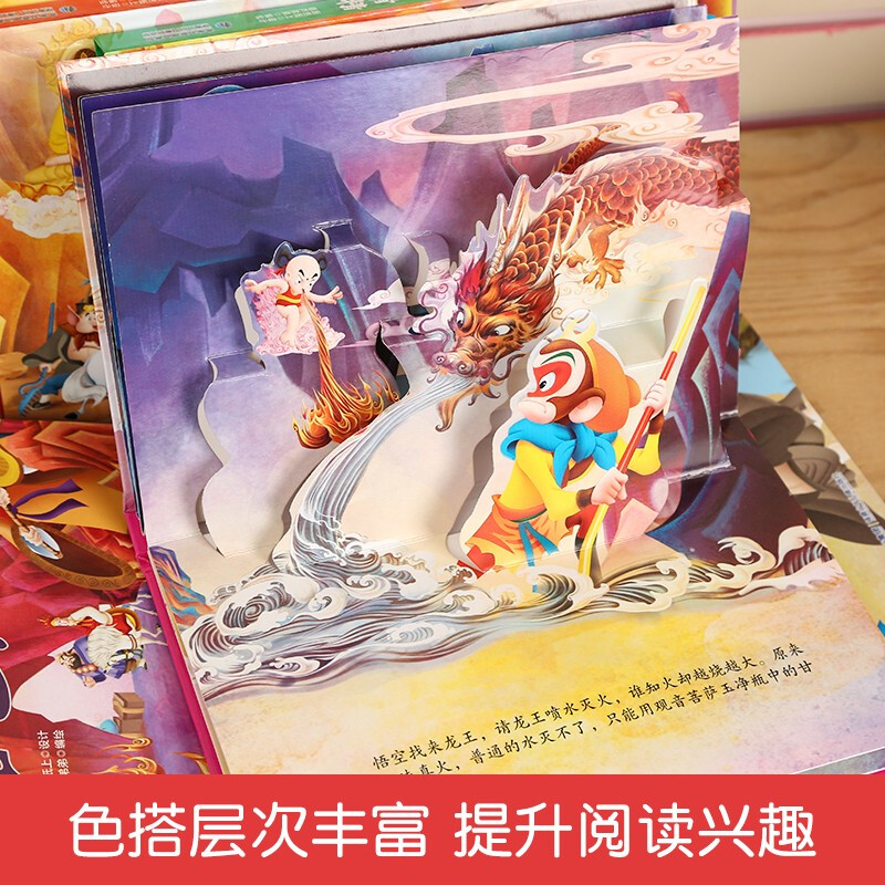 3D立体设计,工艺精细,画面形象,将各种绘画手法运用于立体图画书的创作中,激发孩子的想象力和创造力,让孩子在身临其境般的奇妙阅读体验中,感受古典神话故事的神奇与魅力。