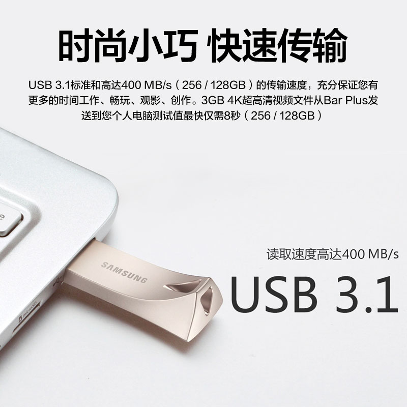 三星Bar Plus系列闪存盘 提供“香槟金”与“深空灰”双色可选,由一体成型金属材质材质打造,坚固耐用无忧日常磕碰,搭配简约流线设计,获得纯粹舒适手感。得益于采用USB 3.1标准,三星Bar Plus系列闪存盘的128GB、256GB版本拥有至高400MB/s的传输速度,而64GB版本也拥有高达300MB/s的传输速度。官方提供5年有限保修。