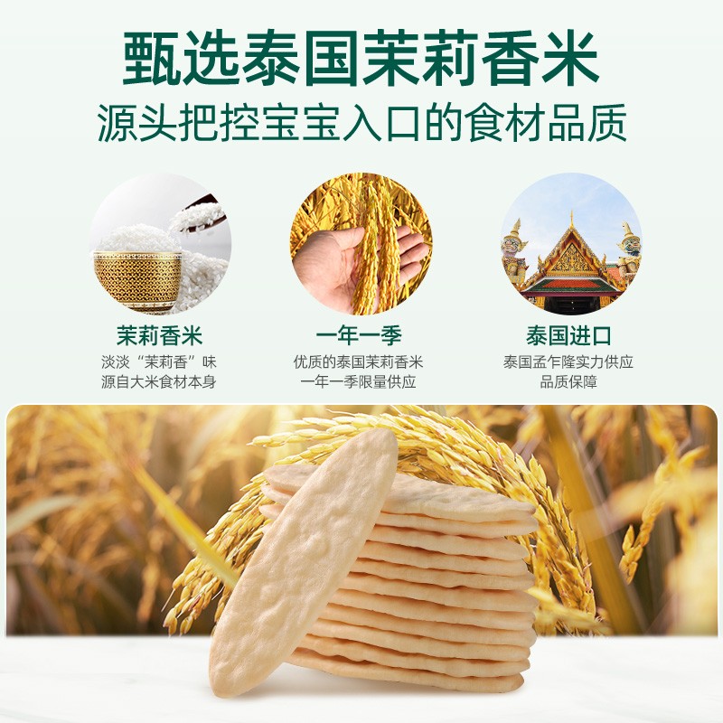 选用优质泰国茉莉香米,符合婴幼儿生产标准,更安全更健康。不添加白糖,非油炸,帮助宝宝收敛口水,磨牙期好零食。