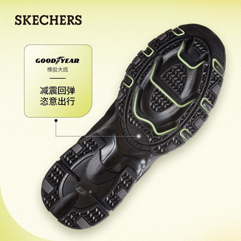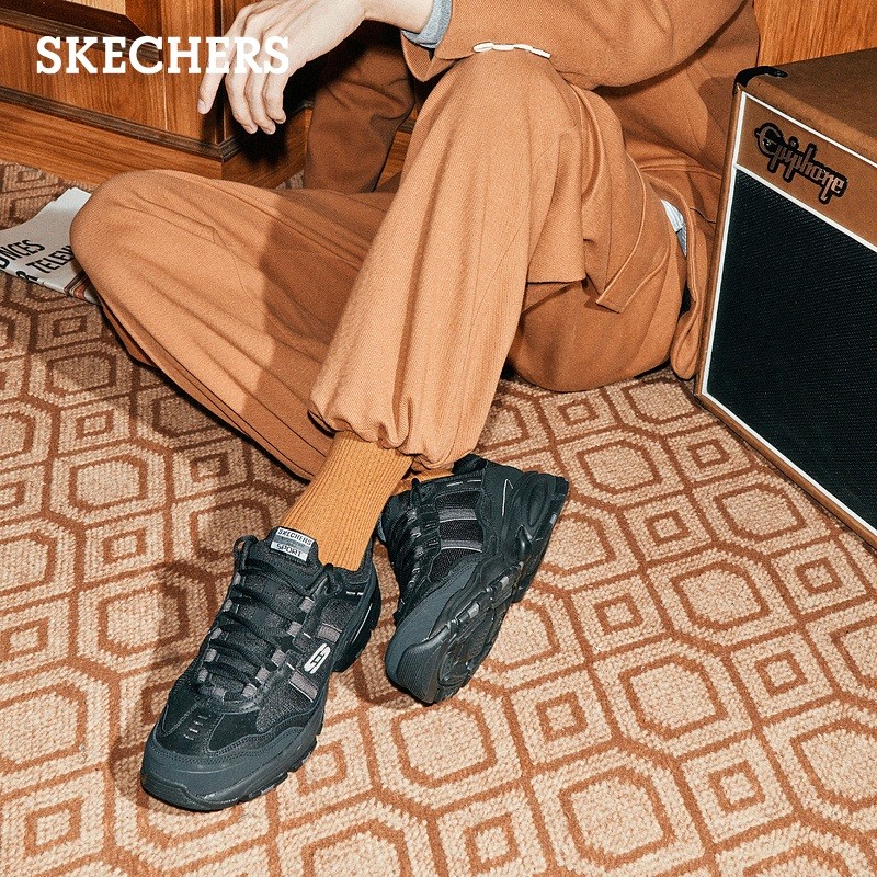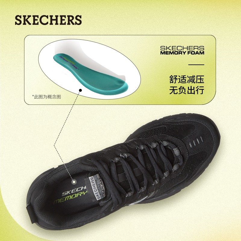 SKECHERS(斯凯奇)是美国著名的休闲鞋品牌,由Robert Greenberg创立于1992年,其明星产品鞋款包括GO WALK3系列、MARK NASON系列、D'LITES系列等。这款运动鞋,复古户外分风格,皮革、织物拼接鞋面,粗犷造型大底。