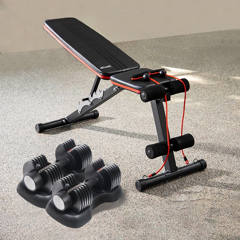 AtivaFit 快速调重哑铃 20kg*2黑色+可折叠哑铃凳 2-20kg广域调节,拥有7个不同重量的哑铃,哑铃铃片纯黑哑光高级,现代感十足,每一块哑铃片都是纯钢打造,精密激光切割成型,铃片外表高温环保,静电喷涂工艺,哑光耐磨高端。稳固支撑,安全牢靠,外部采用环保橡胶材质包裹,,舒适安全防滑长时间使用也不伤手;可折叠哑铃凳稳固结构双重防护,三角构架靠板支架,稳定不摇晃。7档调节满足不同需求,多角度调节全家适用。柔软透气耐磨皮革,好材质让运动成为享受。弹力拉力绳,用于辅助锻炼,缓解筋缩严重者。