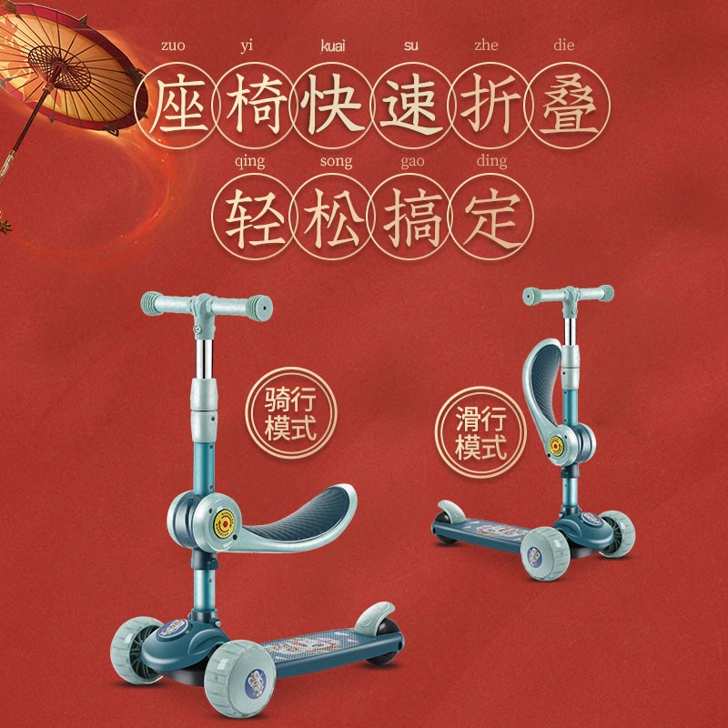 该滑板车带有国潮贴花,传统与现代文化的结合,新颖有趣。座椅可一键折叠,四档高度可调节。承重高达100kg,后轮脚刹,一踩即停。车身黄金三角形构造,不易侧翻。多种款式可供选择。